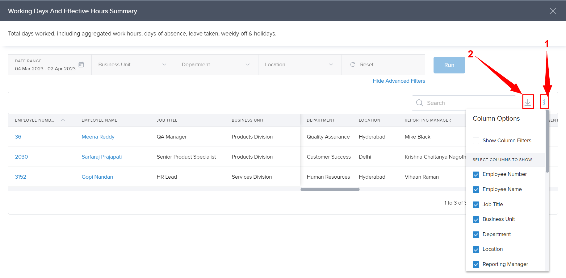 For example, if you want a report summarizing the number of working days, leaves, and working hours status of the employees for the past 30 days, You can go to the Attendance Reports (1) section and click on Working Days & Effective Hours Summary (2).