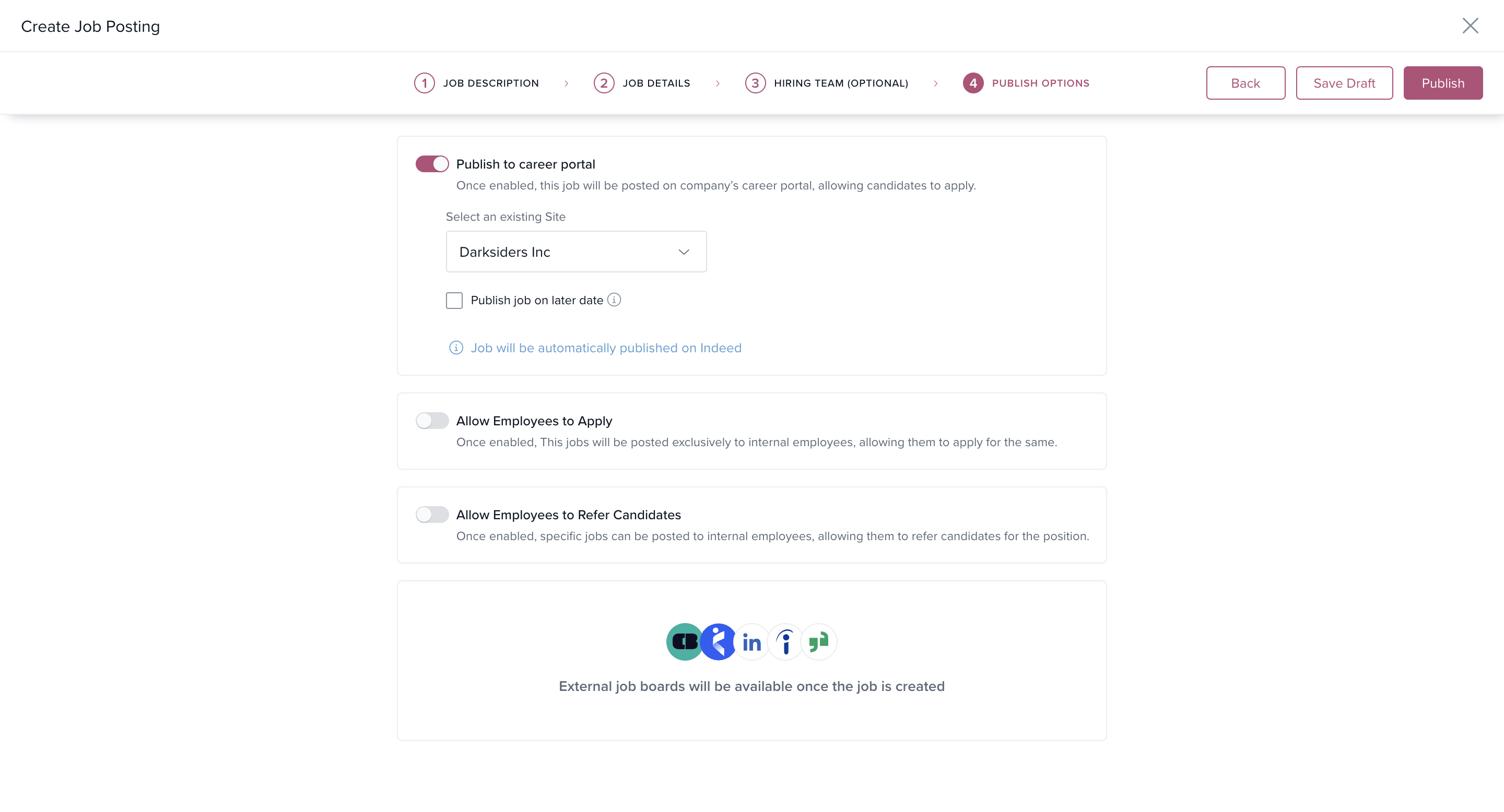 Toggle Publish to Career Portal to make the job live externally. Choose the desired career site.