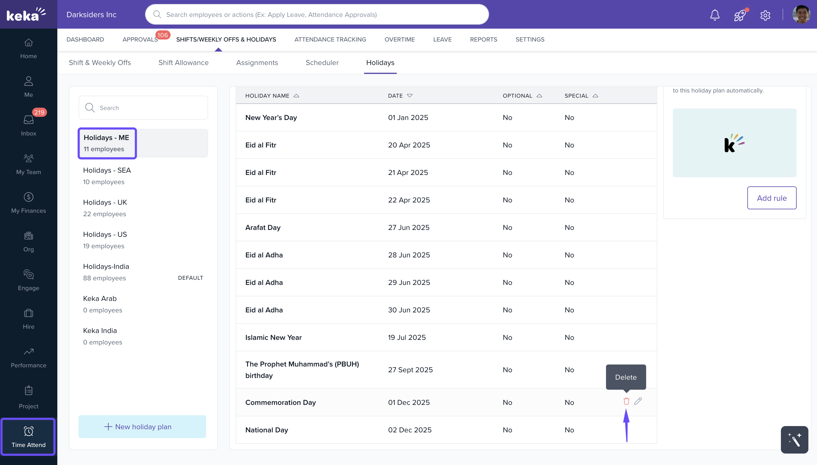- Browse through the list and click the Delete Icon for the holiday you want to remove.