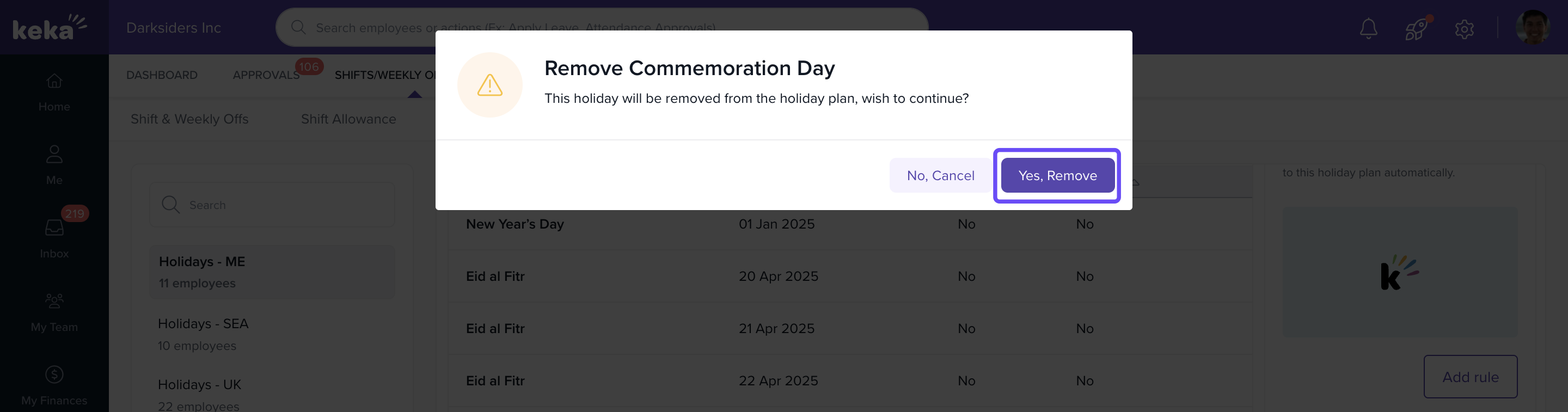 - When the confirmation pop-up appears, click Yes, Remove to confirm the deletion.