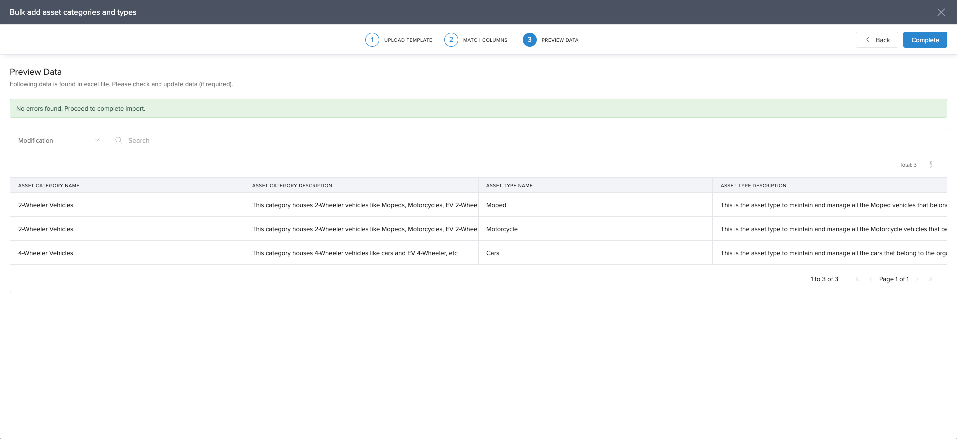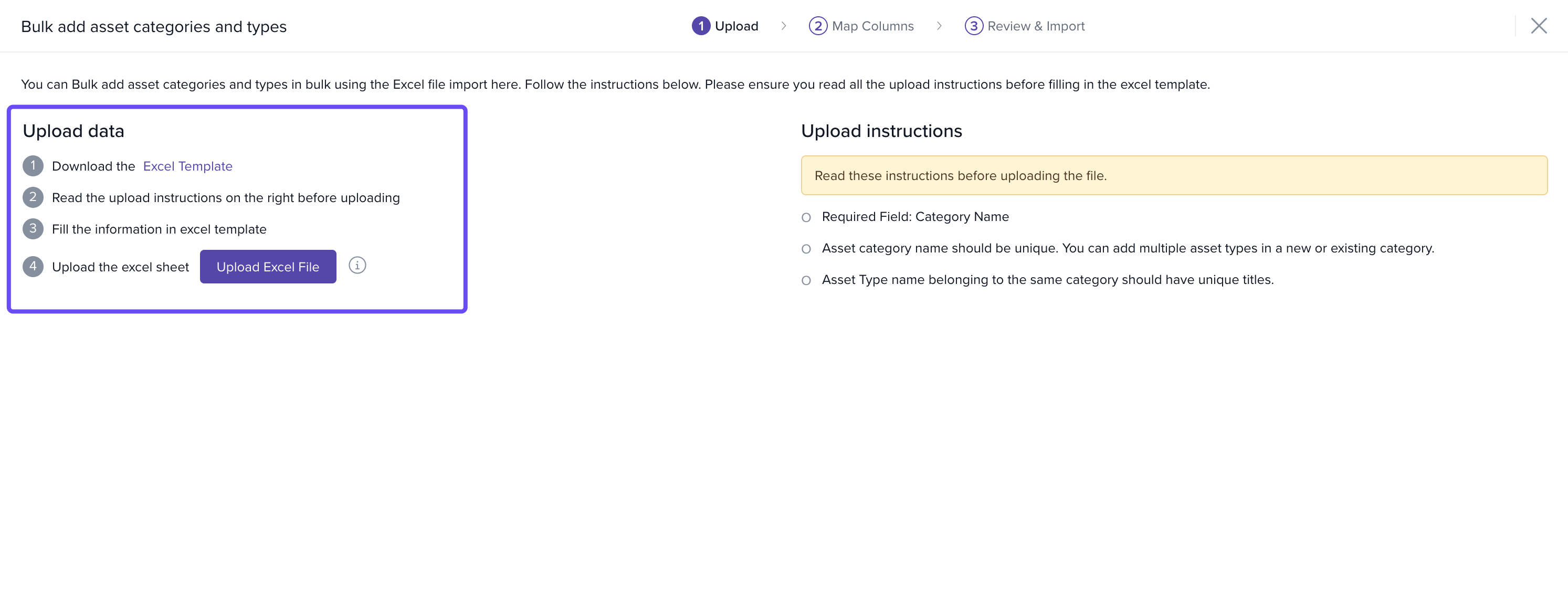On clicking on bulk import you can view the instructions to bulk upload asset categories and asset types.