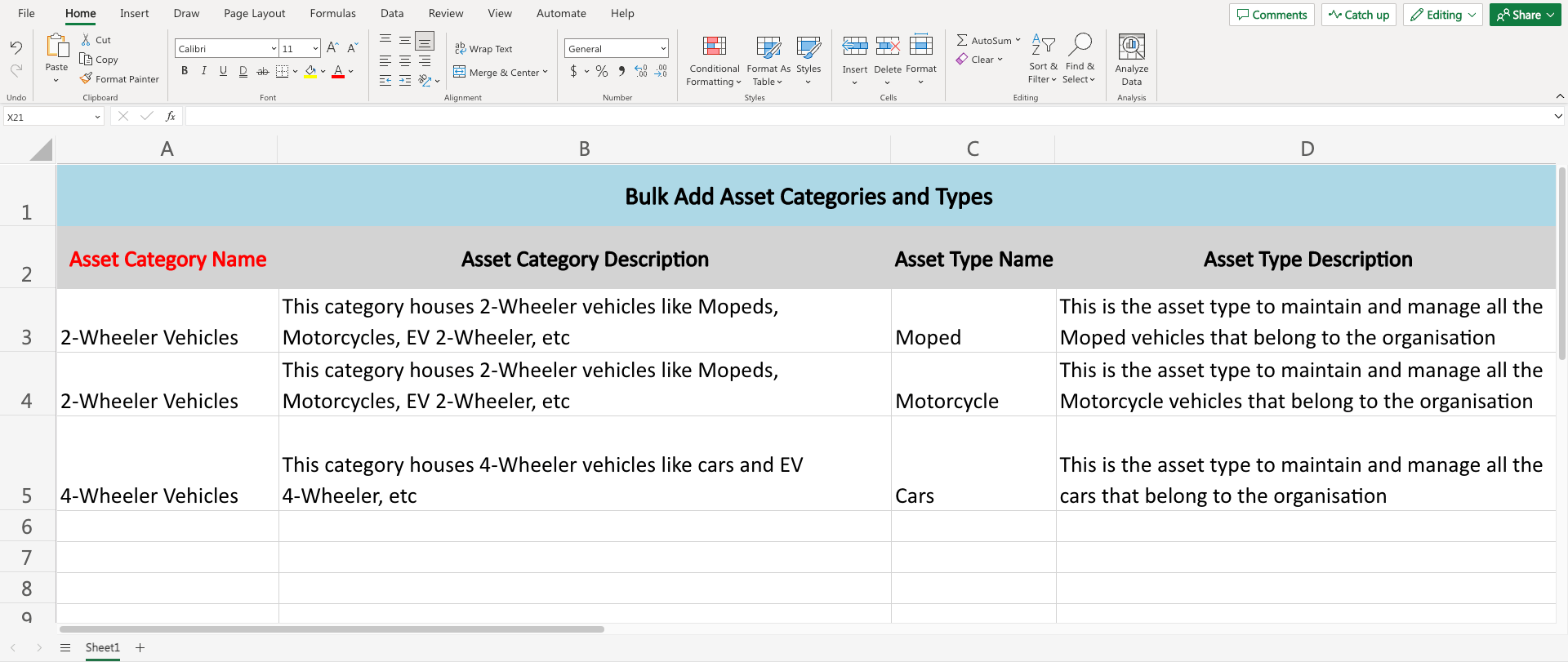 Adding asset categories in bulk