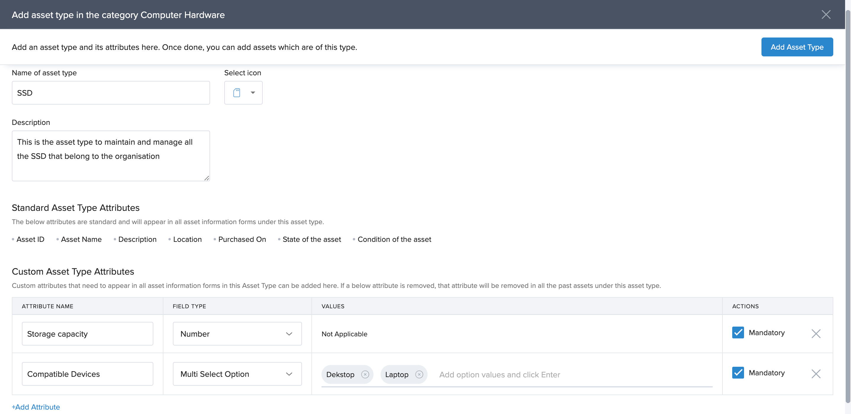 Standard attributes appear for all asset types by default. These are the various parameters that can accurately define an asset and also help in keeping track of the state of the asset and the condition of the asset.