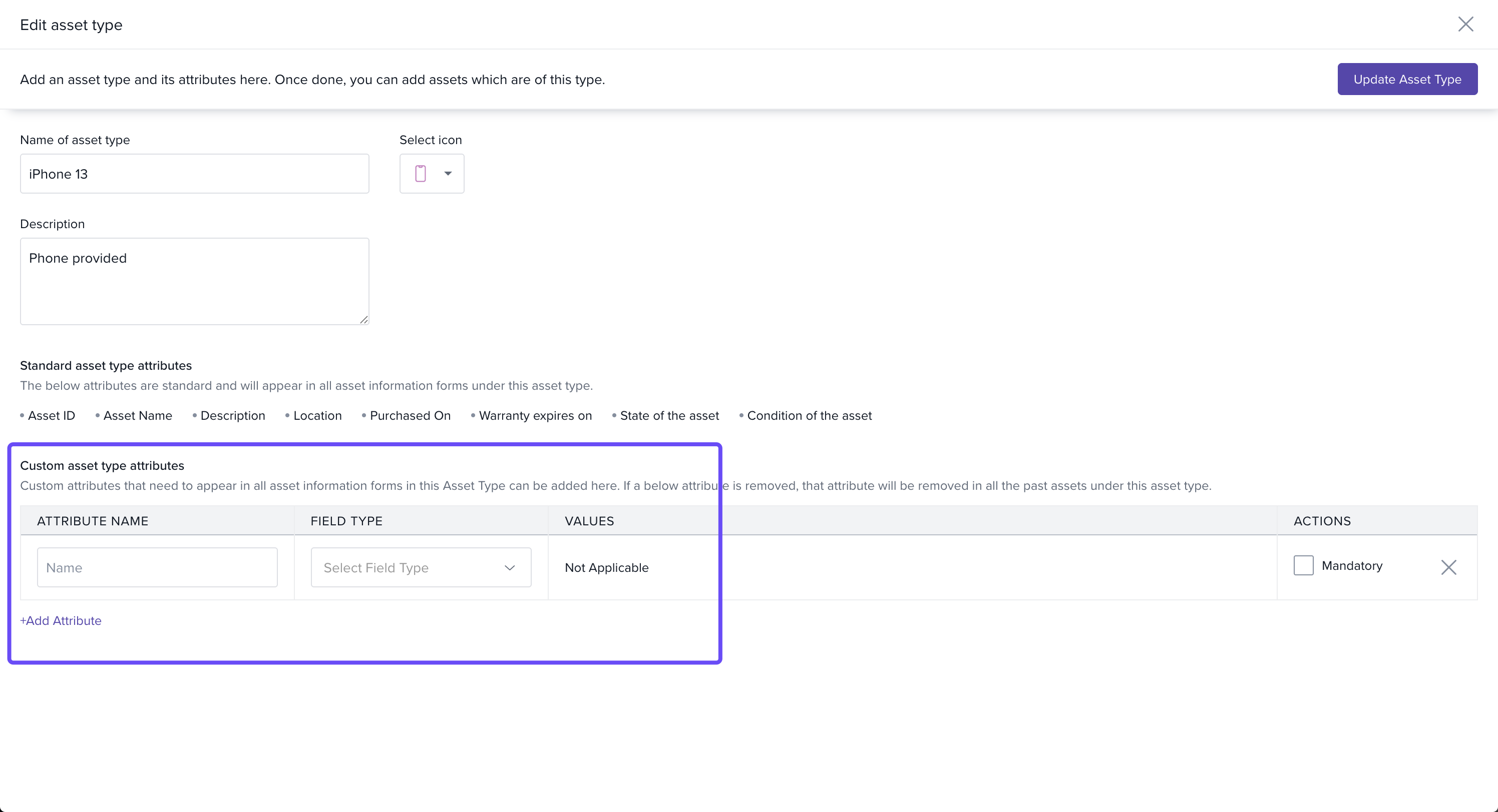 In the Edit Asset Type screen, click + Add Attribute.