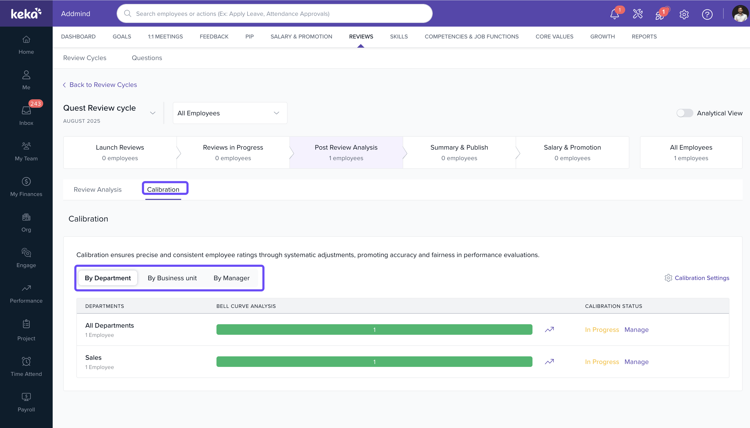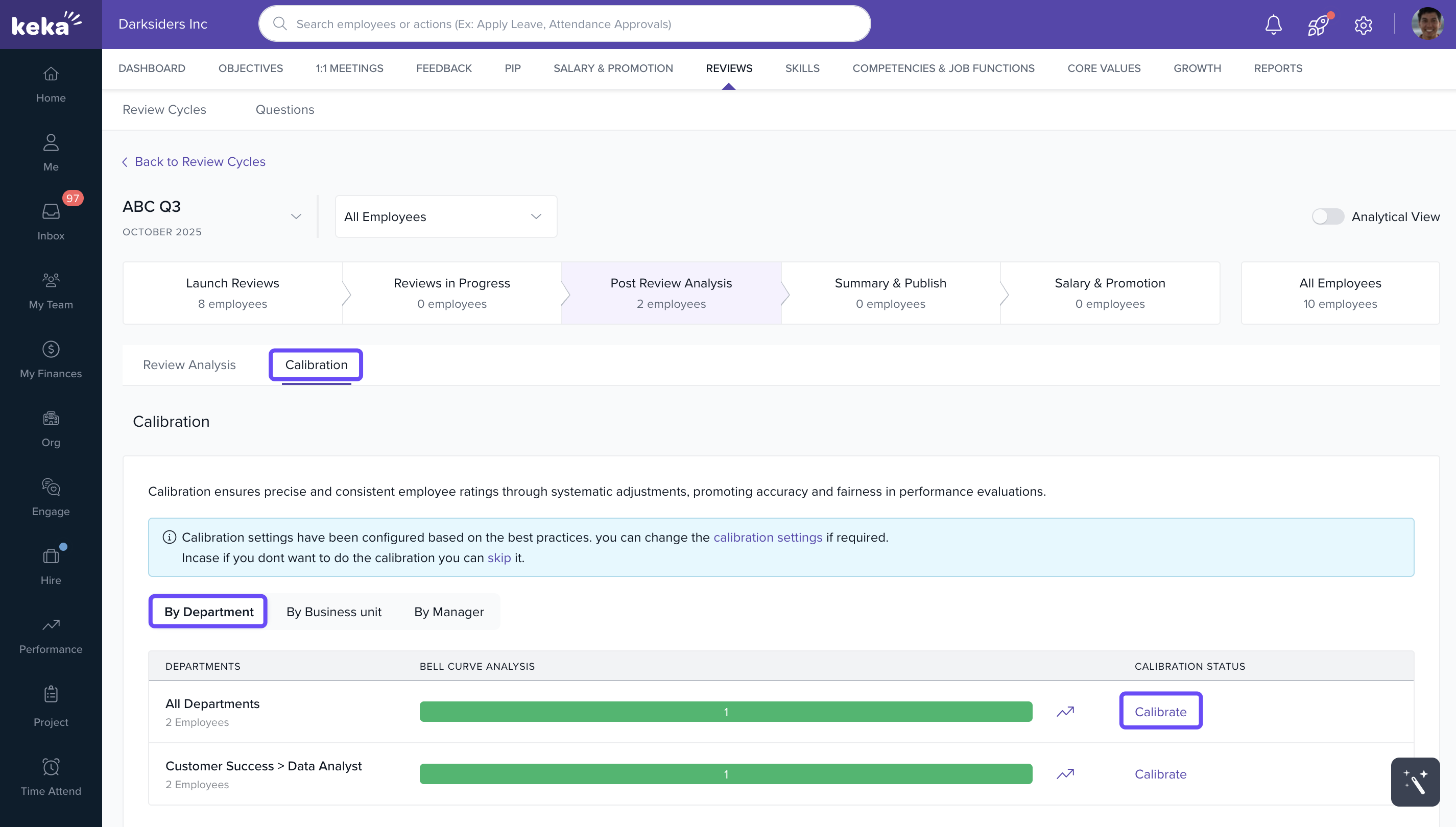 Keka now provides robust filters to refine which employees appear in the calibration interface: