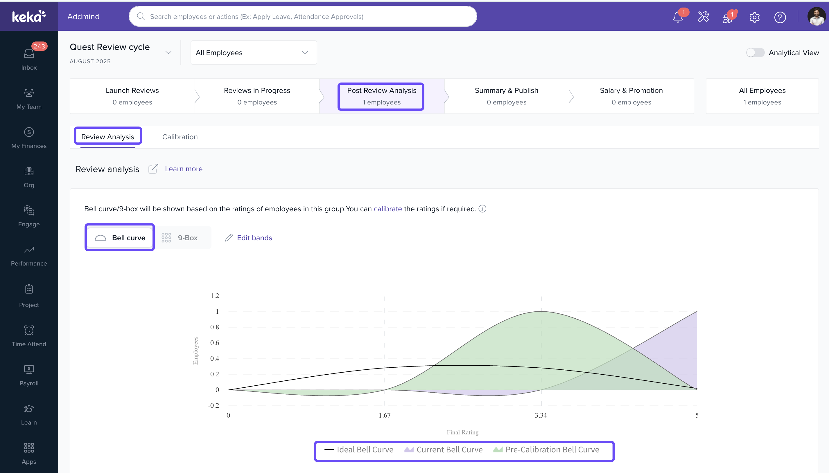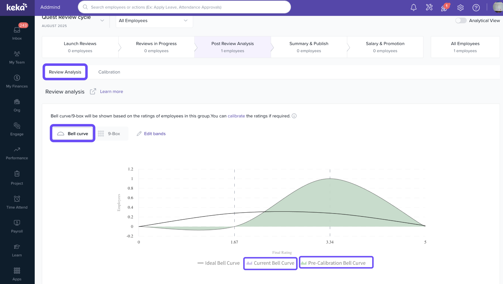 Keka’s Post Review Analysis offers two visual tools—Bell Curve and 9-Box Grid—that help HR and leaders compare ratings against company-wide benchmarks.