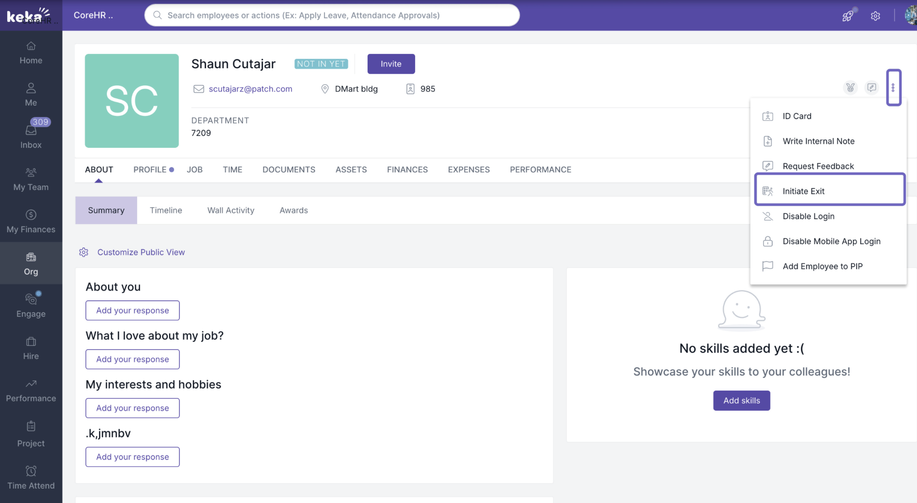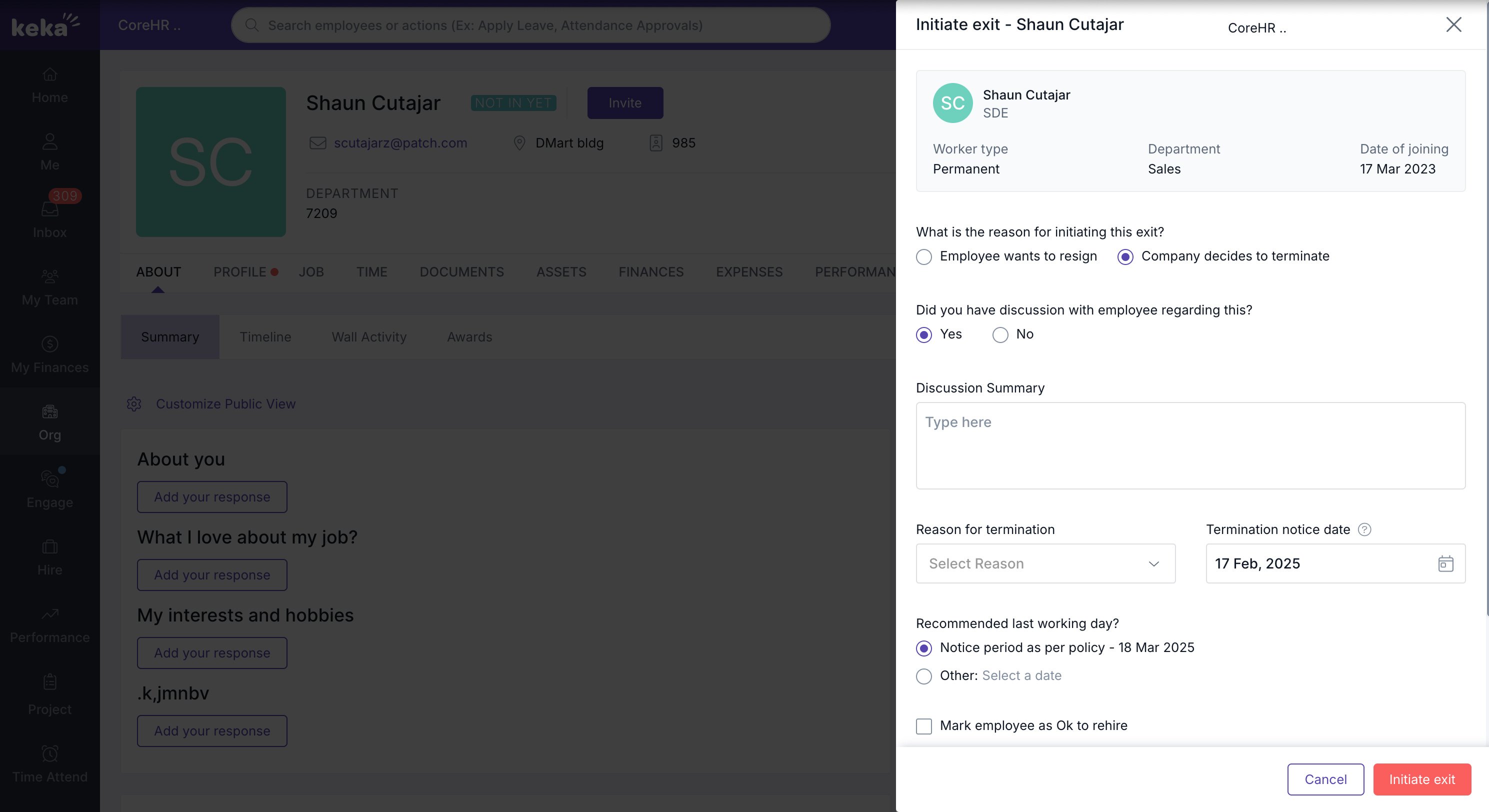Go to the employee's profile in Keka. In the top right corner of their profile page, click on the three dots (the options menu).Select 'Initiate Exit'