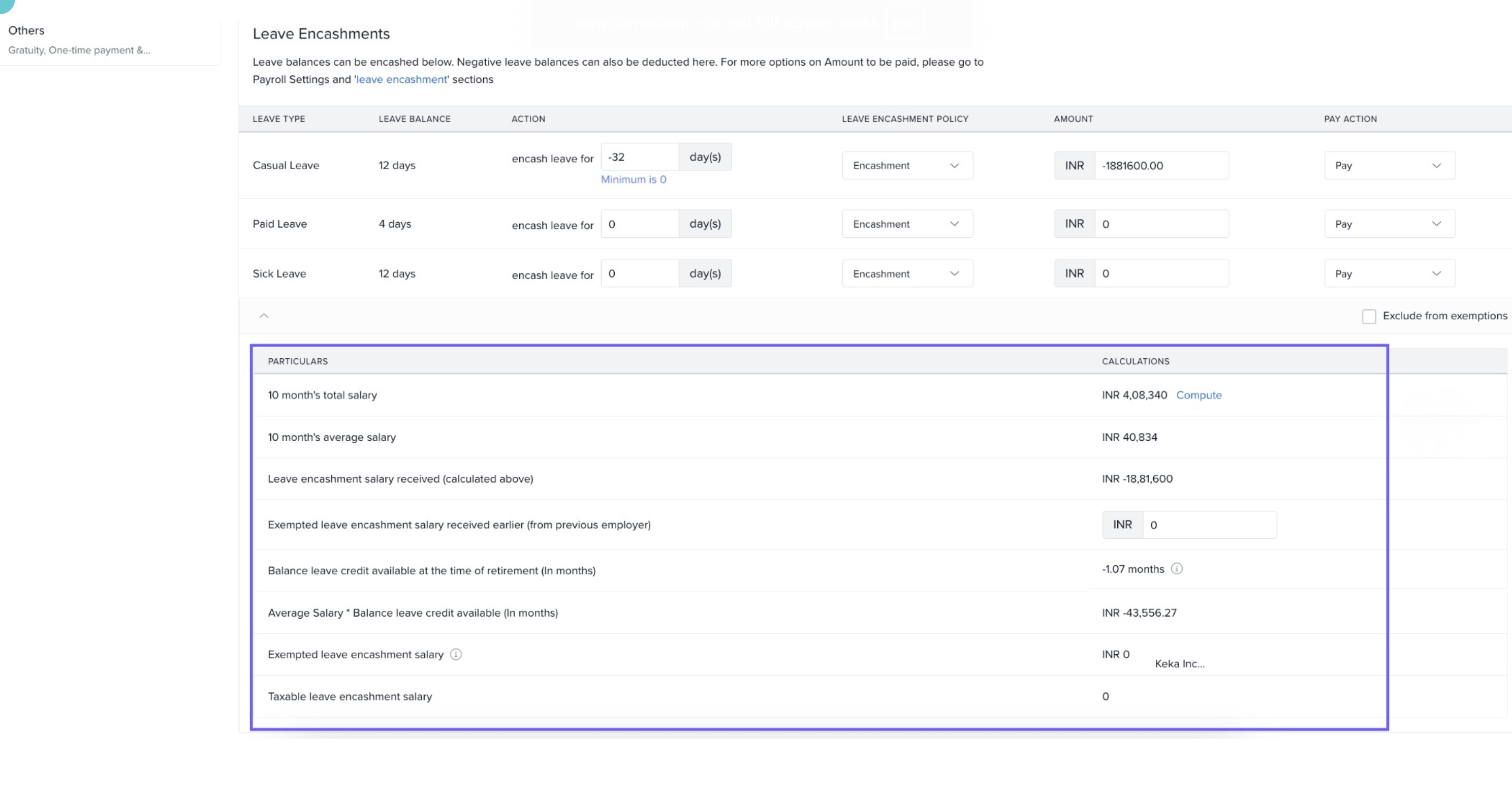 Leave Encashment is the payment made to an employee for unused paid leaves, typically at the time of resignation or retirement. Many organizations allow employees to carry forward unused paid leaves, and the compensation for these unutilized leaves is subject to taxation. In Keka, you can update the tax exemption amount for leave encashment during the Full and Final (FnF) process.