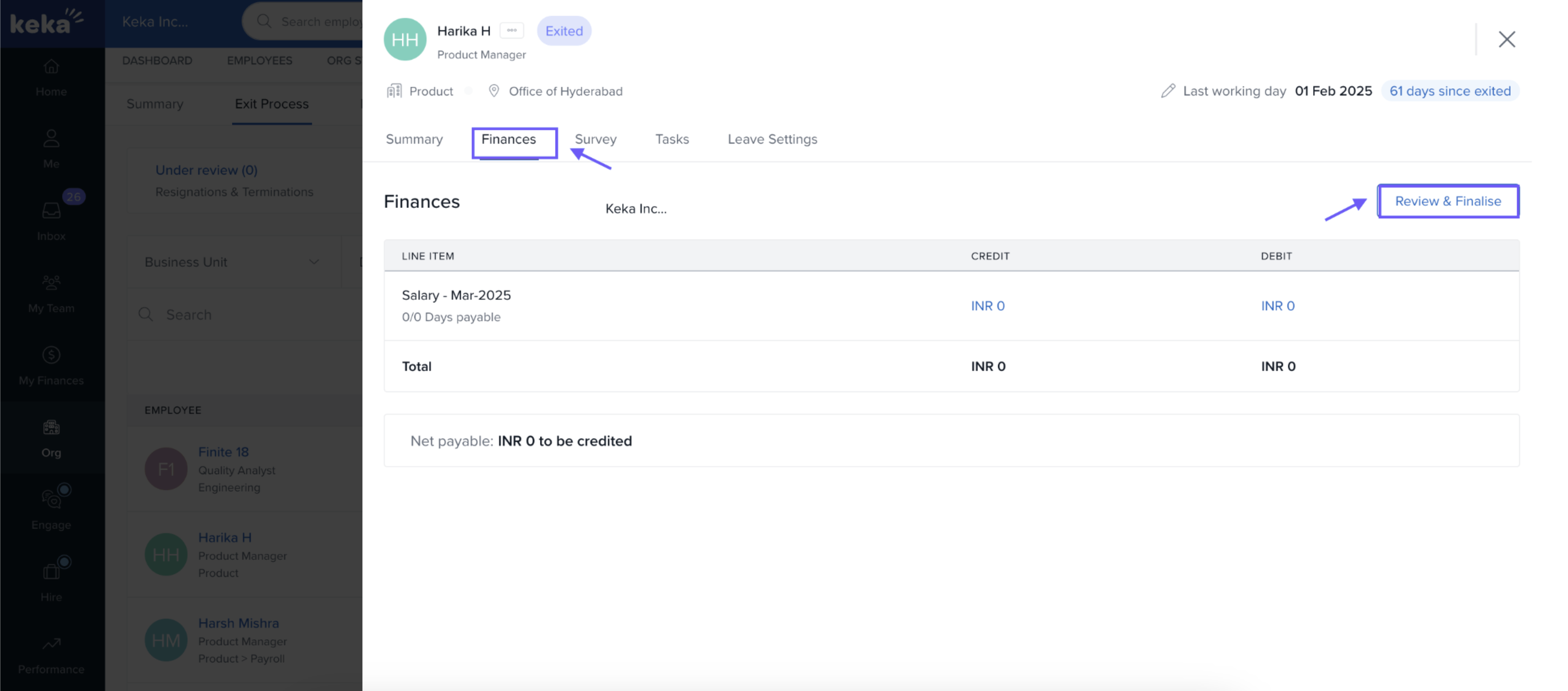 In the employee details page, go to the Finances tab and click Review & Finalize