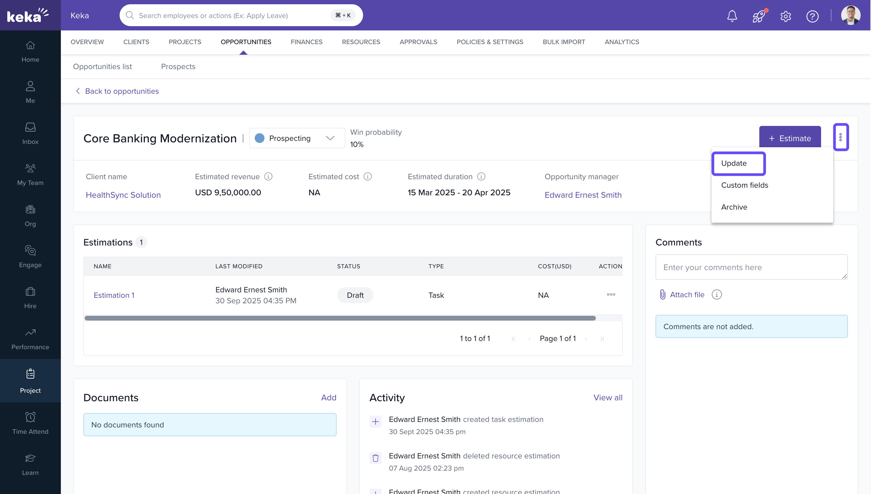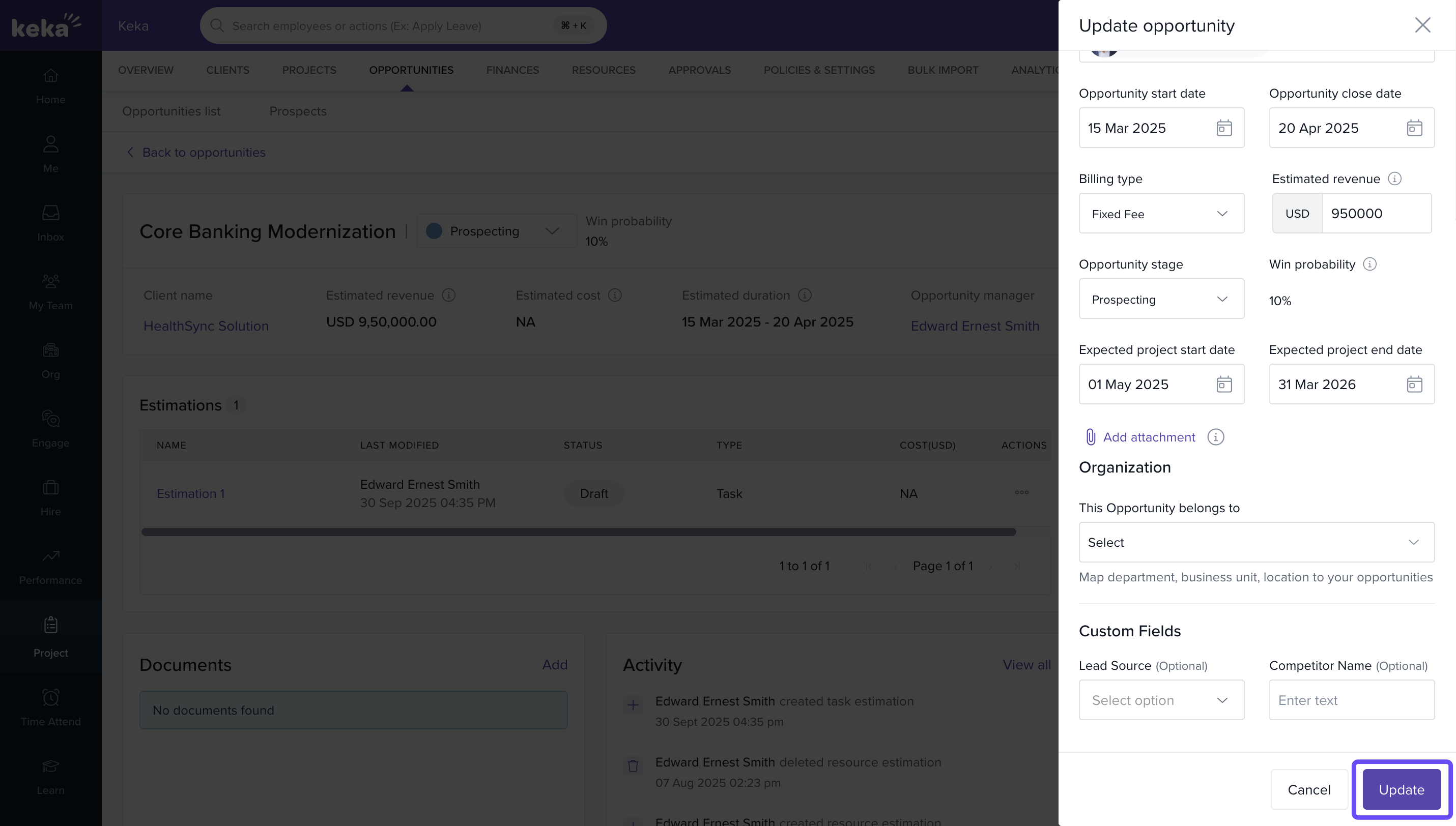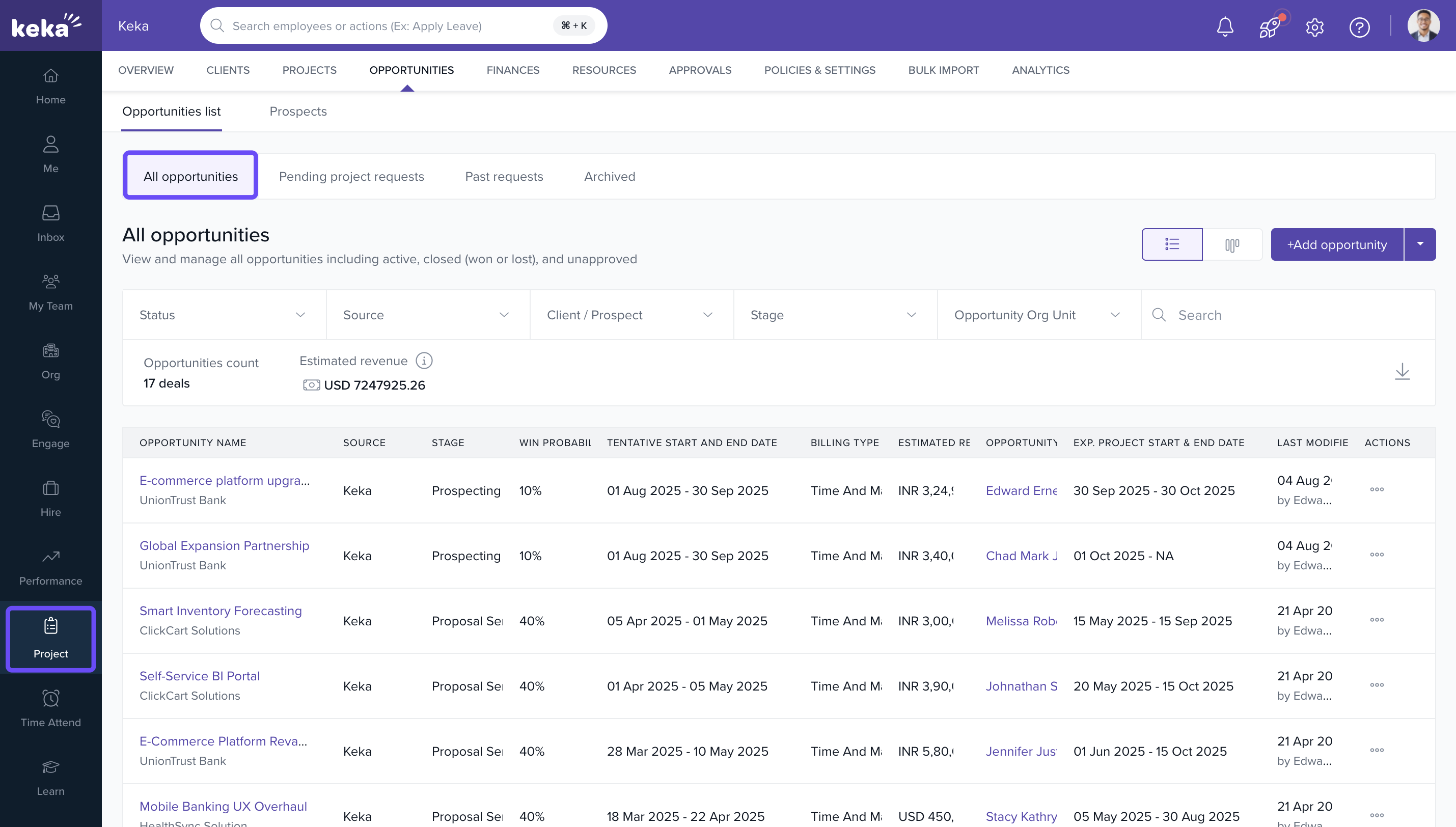This article guides you through managing opportunities in Keka PSA—from updating opportunity details and adjusting stages to converting a successful opportunity into a project. It helps teams track sales progress, maintain opportunity data, and streamline the handoff to delivery teams.