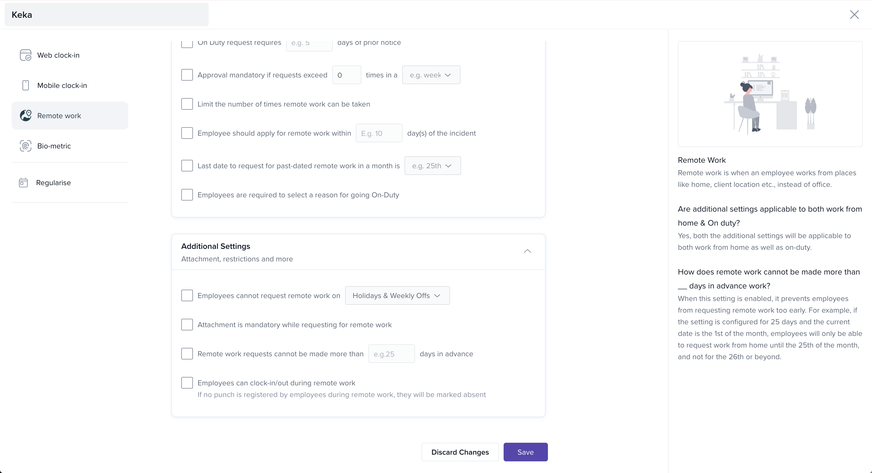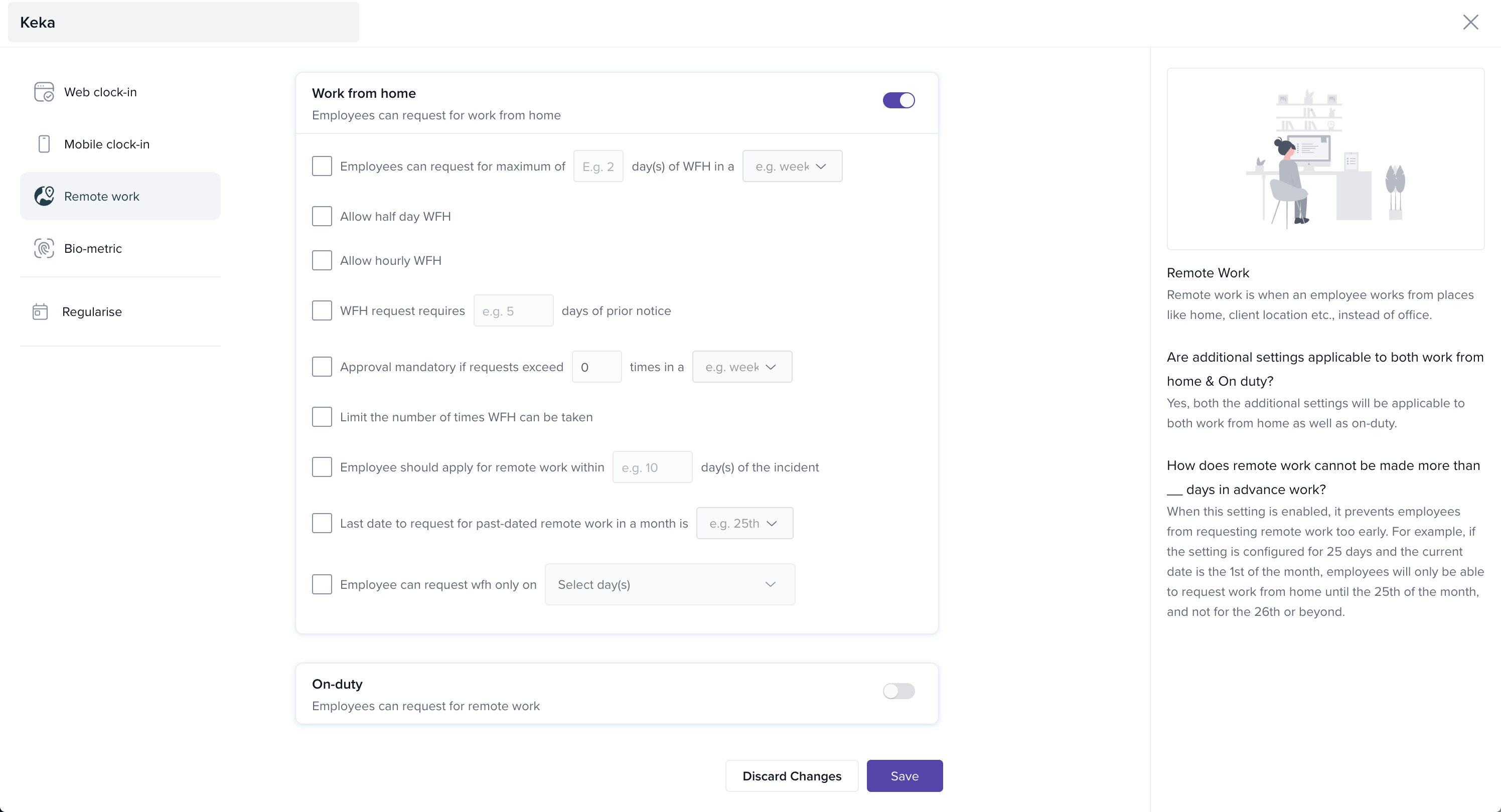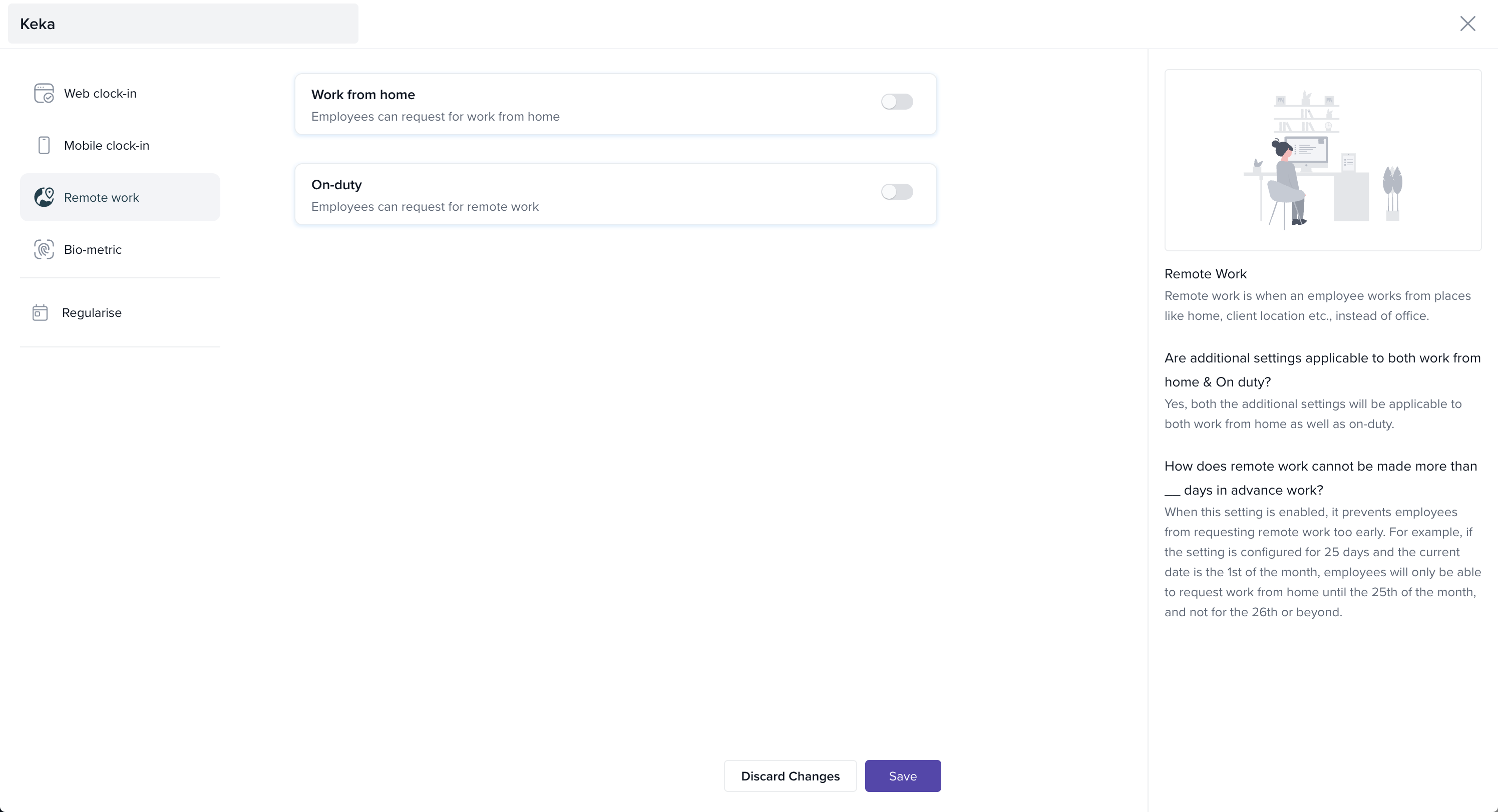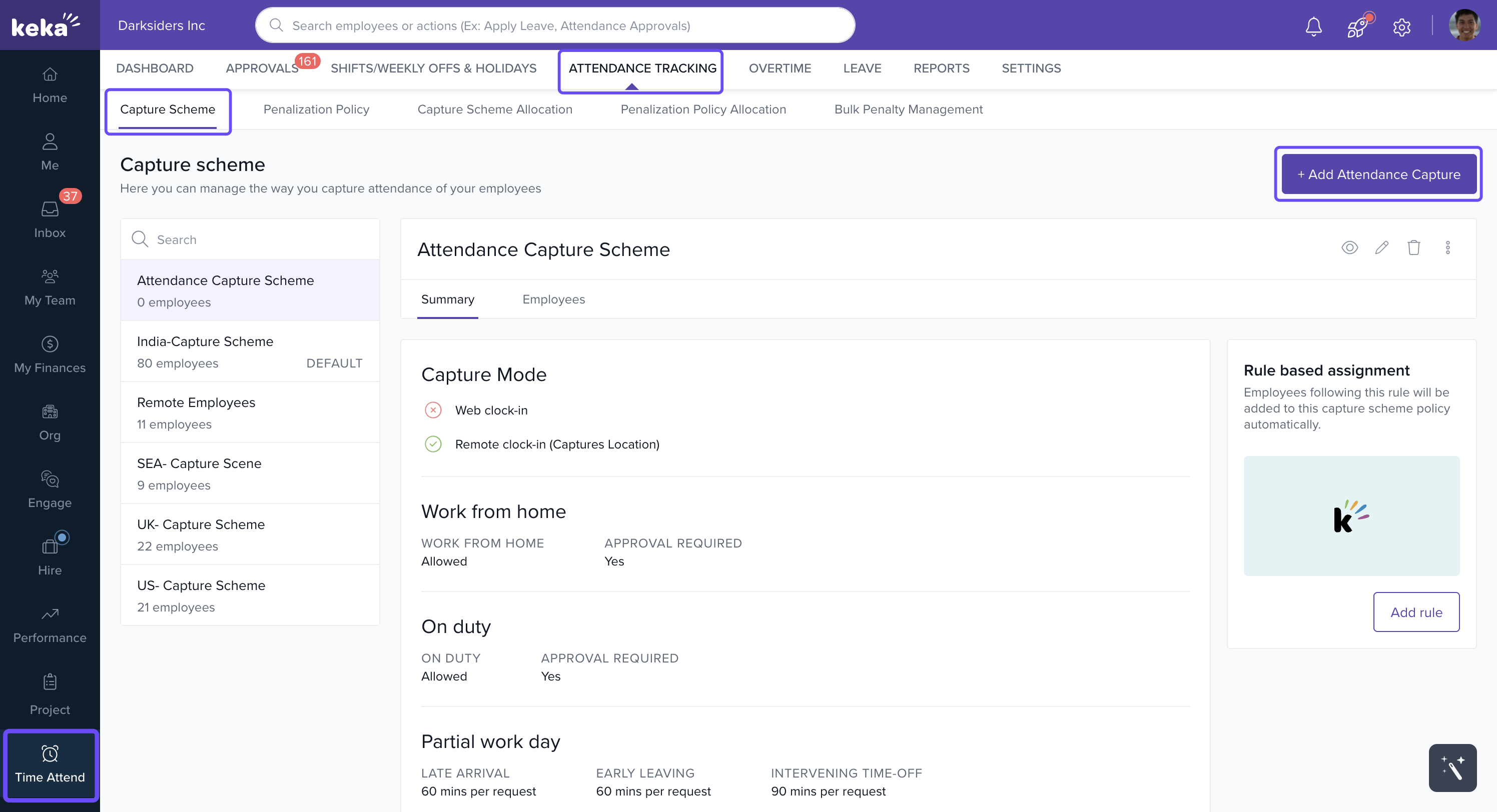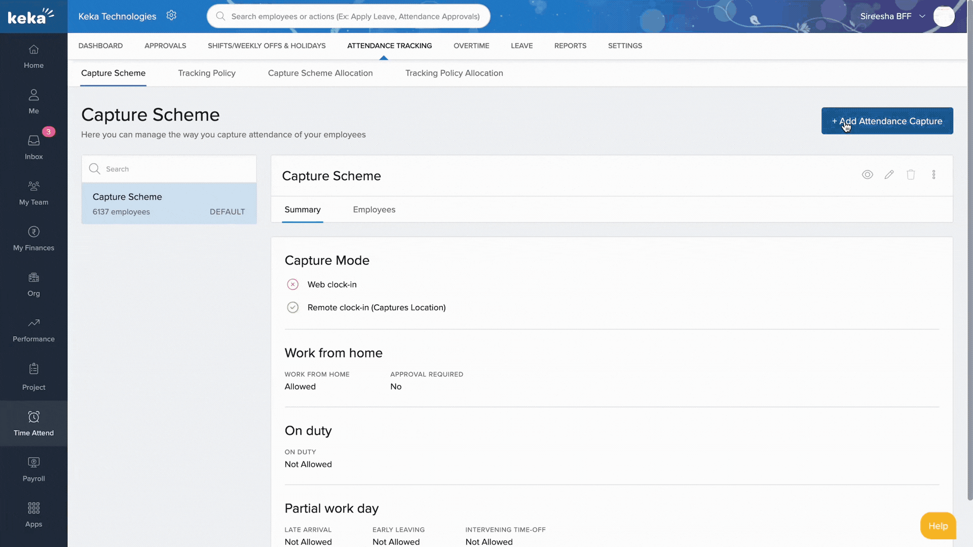 An attendance capture policy defines how employee attendance is recorded in Keka. As an admin, you can create capture schemes that match your organization’s work model—whether employees clock in via web, mobile, or remote work requests.