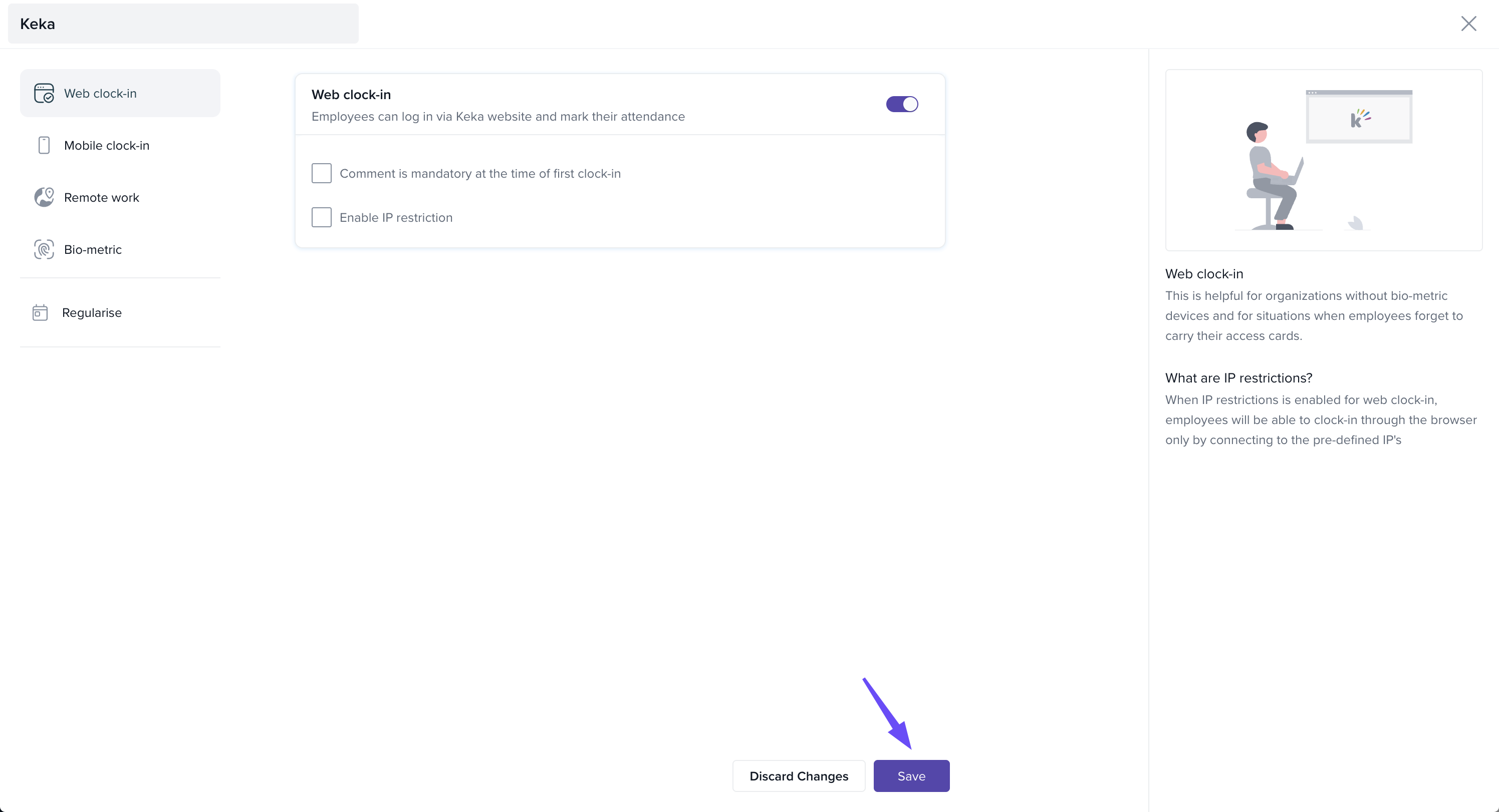Note: Biometric device configuration is handled separately. For setup help, please contact Keka Support.