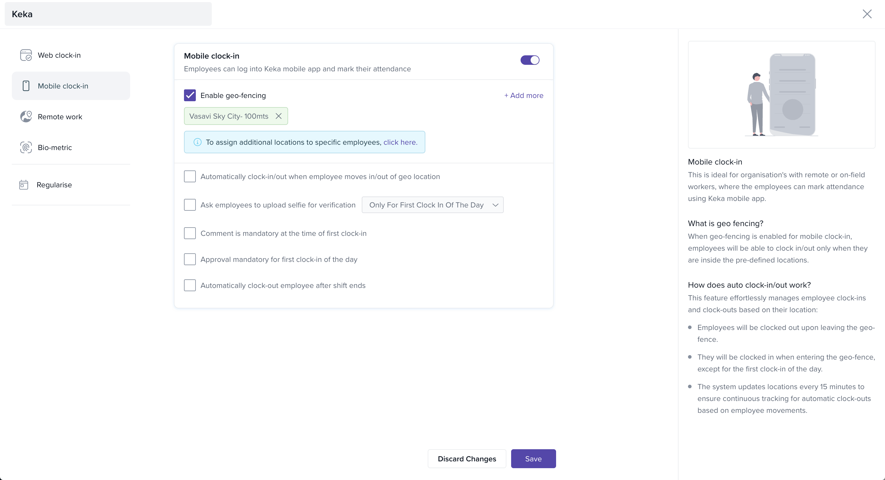 Enable geo-fencing so clock-in/out works only inside designated areas.