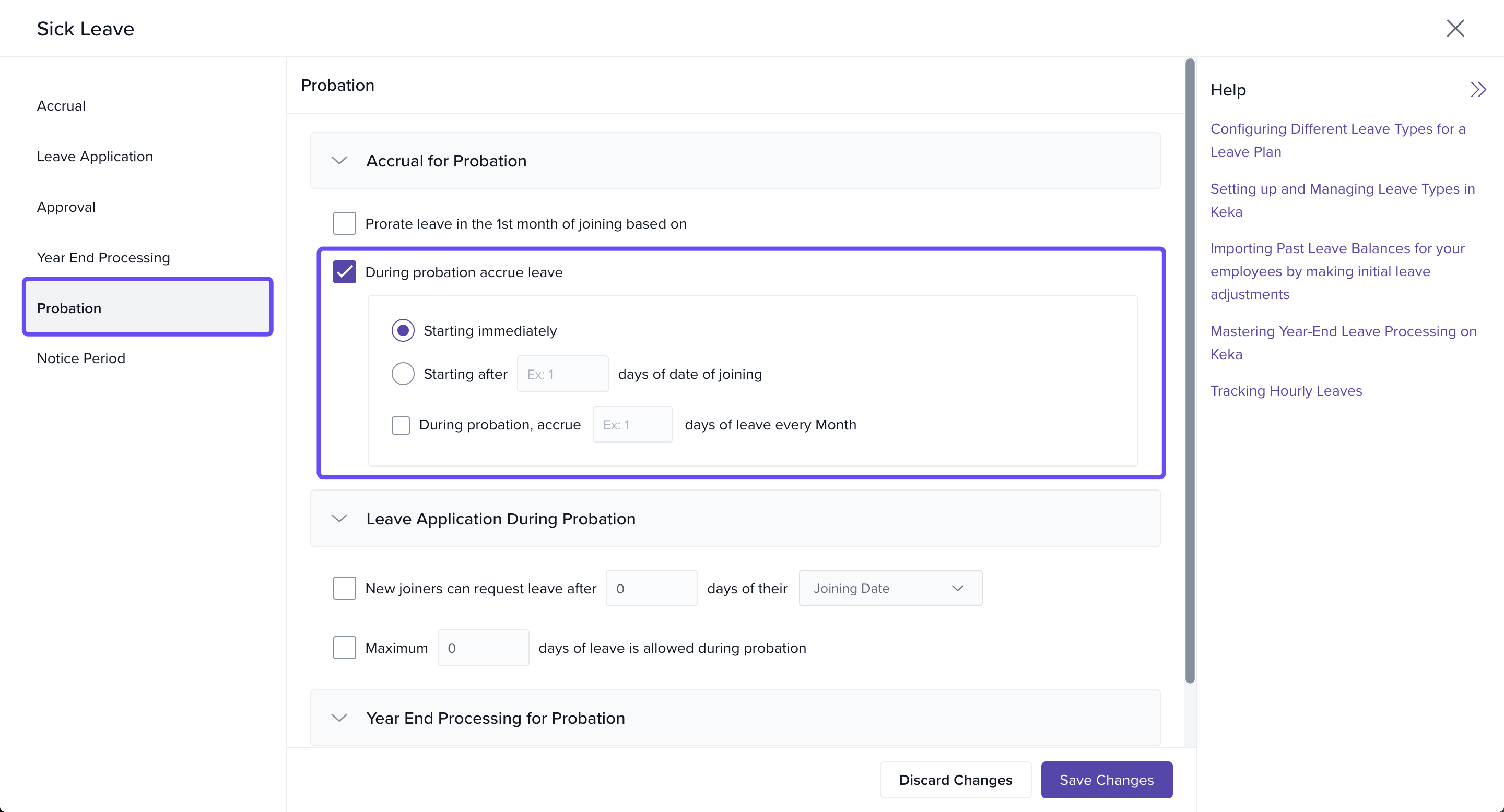 This guide shows you how to enable and customize leave accrual settings during the probation period, based on the employee’s date of joining.