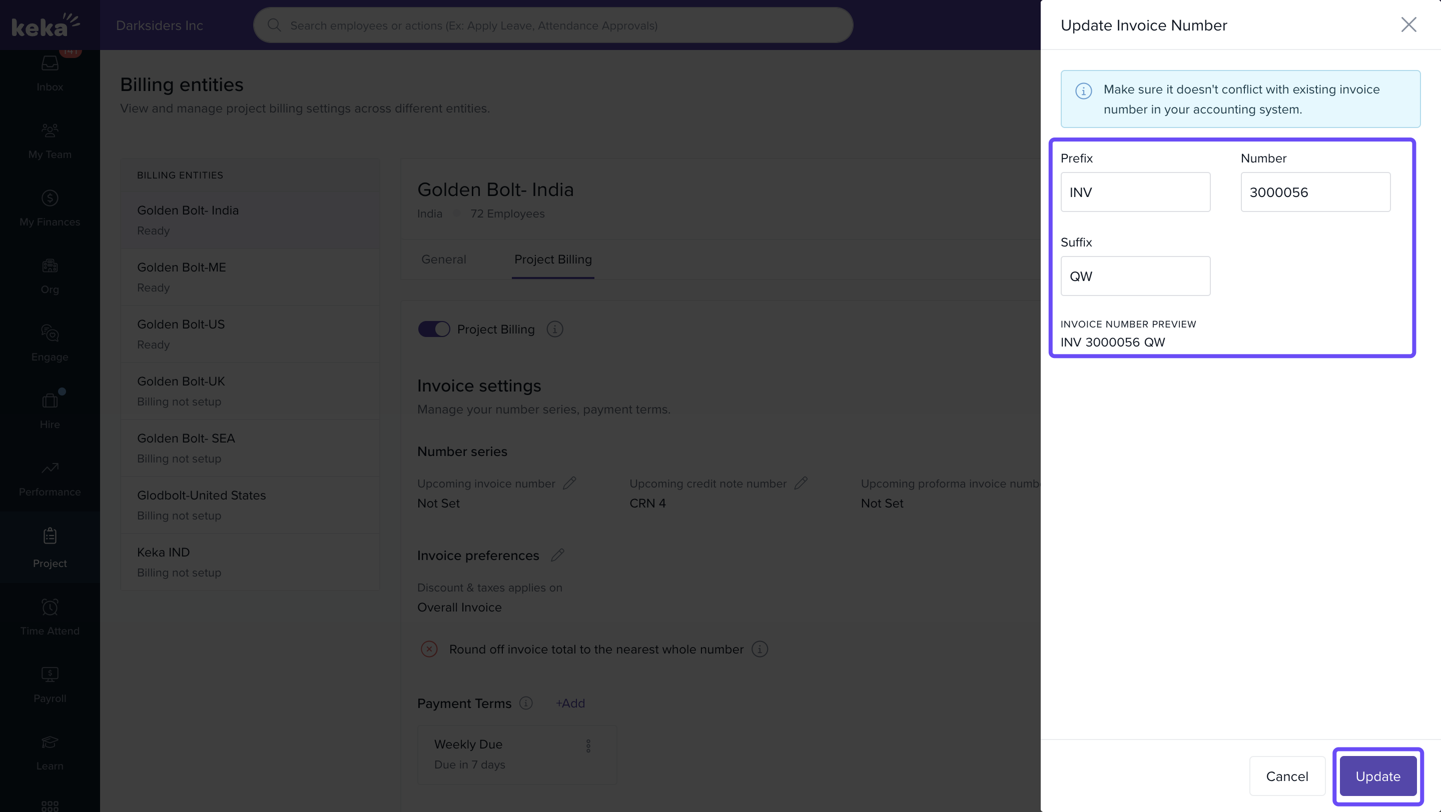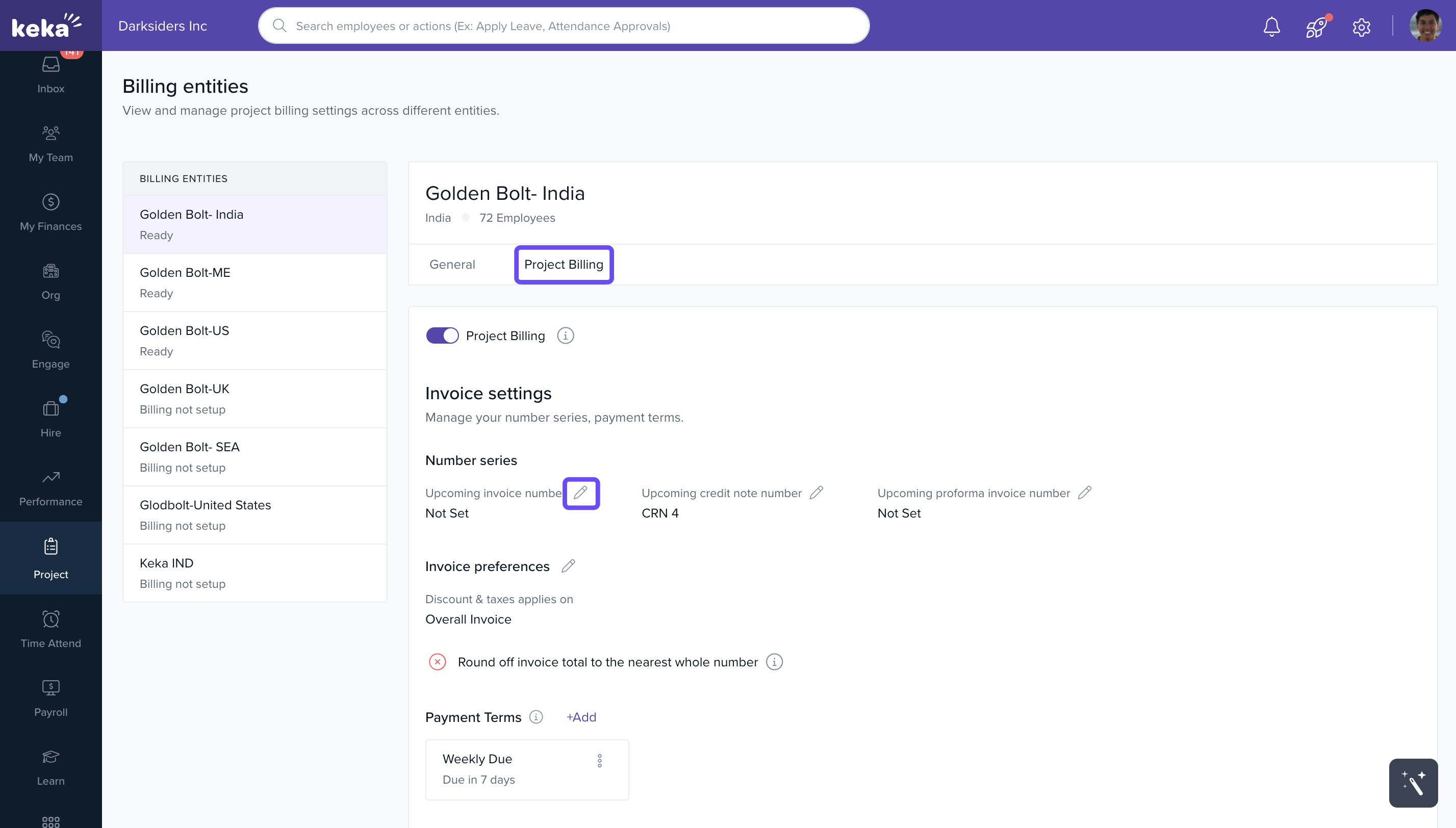 To learn more about managing billing entities and invoice settings, visit: Managing Billing Entities and Invoice Settings on Keka PSA.