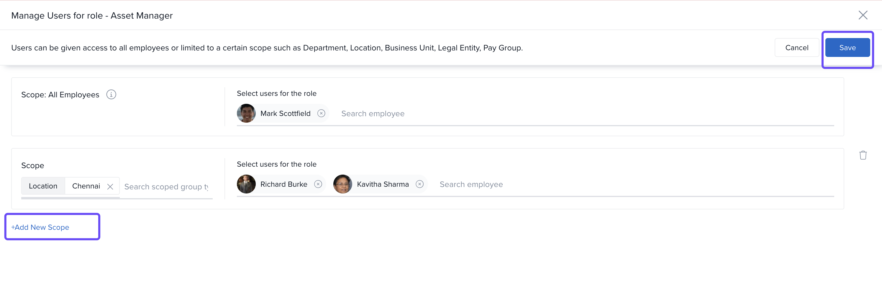 Add New Scopes: If needed, click on Add New Scope to assign asset managers to specific departments, locations, or other scopes.
