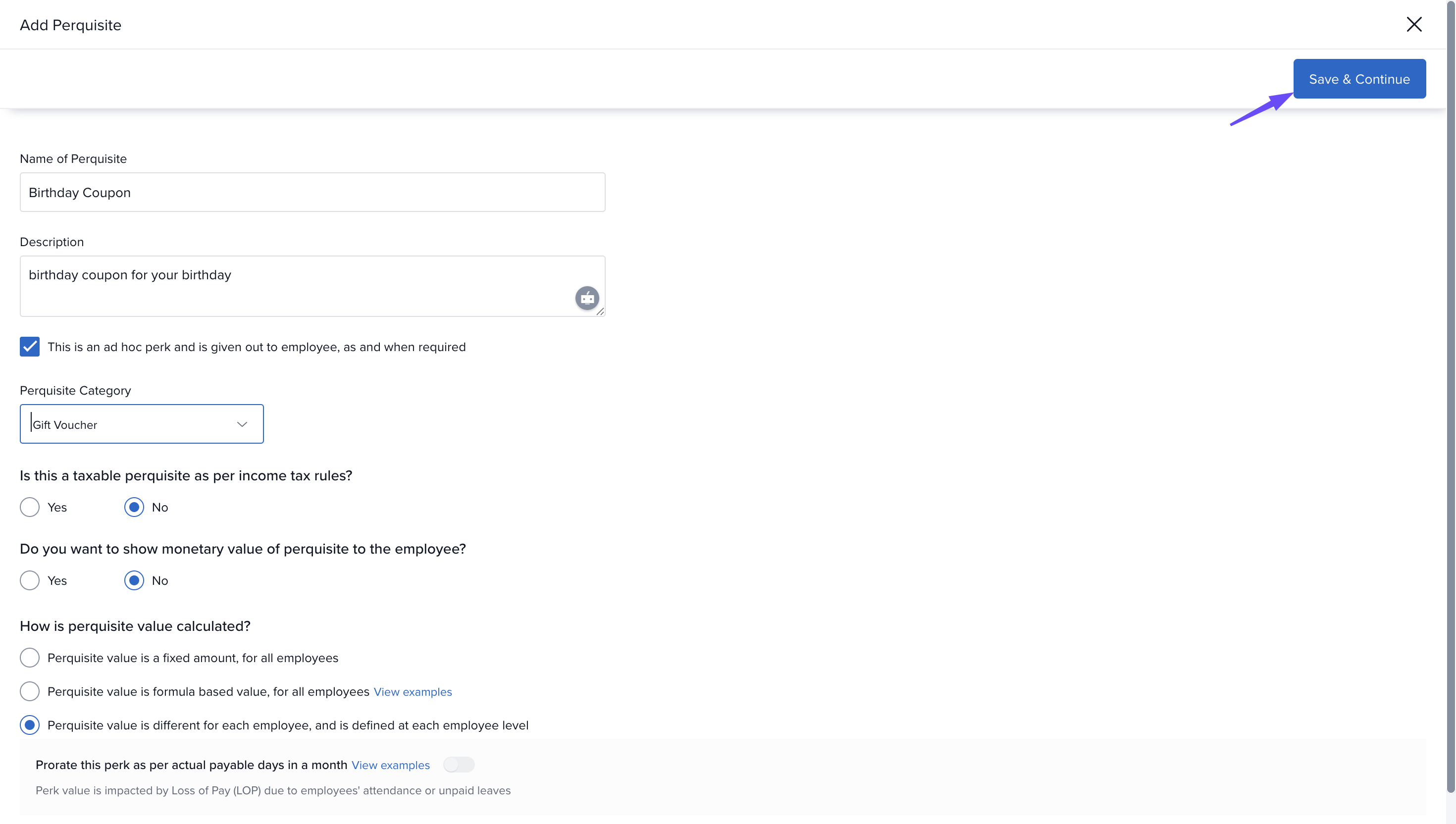 Once all the details are filled in, click Save & Continue to add the perk to the Keka repository.