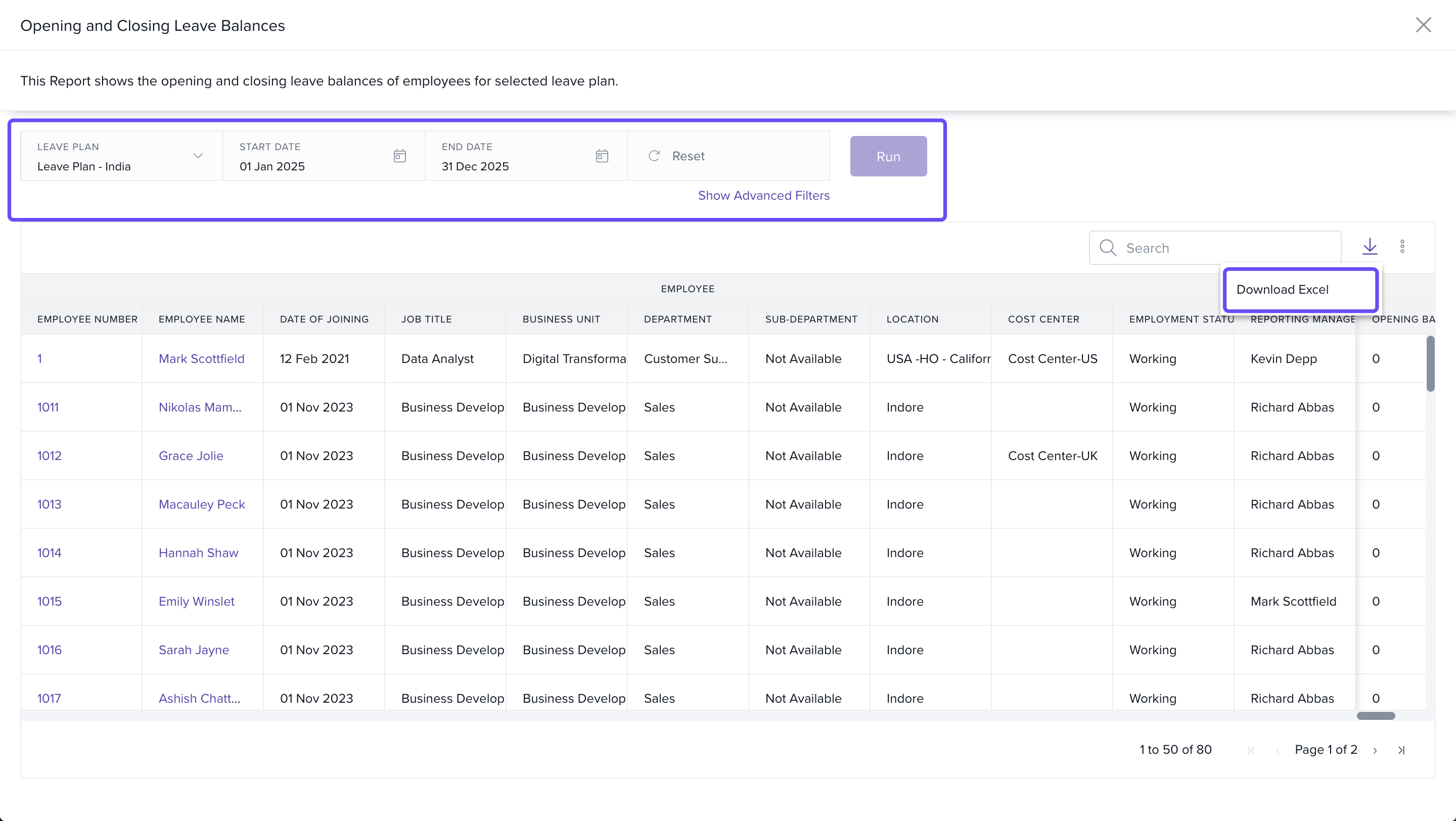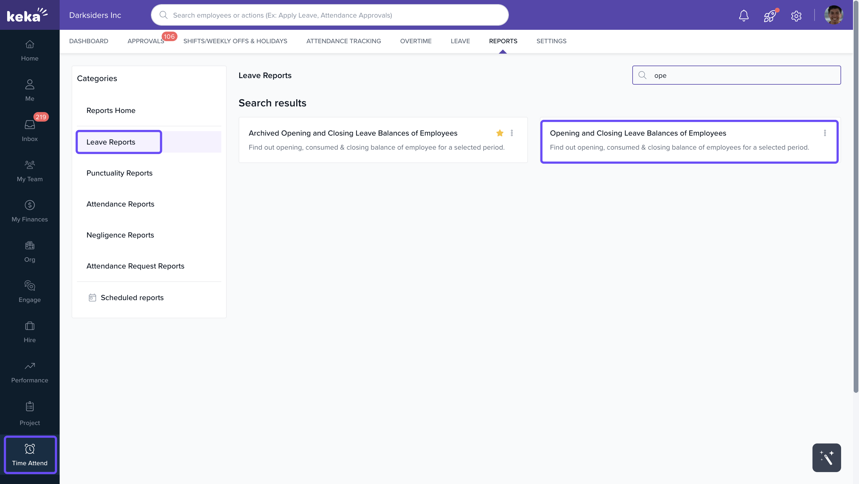 - Under Leave Reports, select Opening and Closing Leave Balances of Employees.