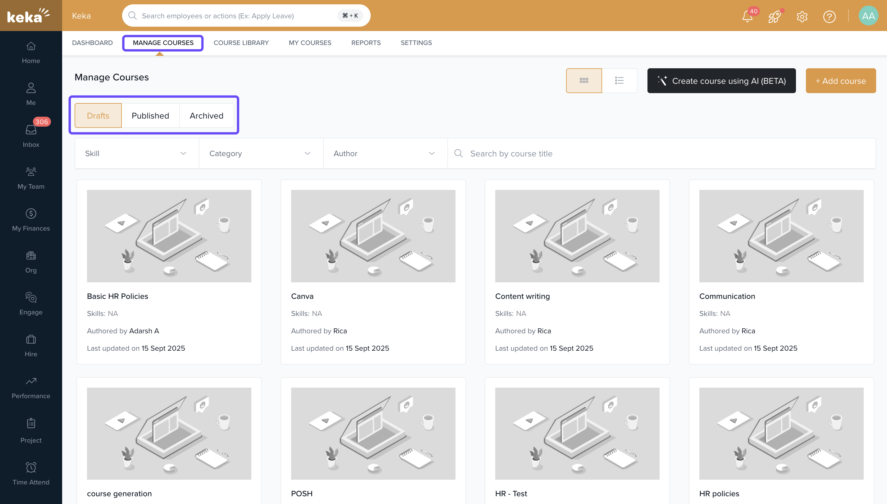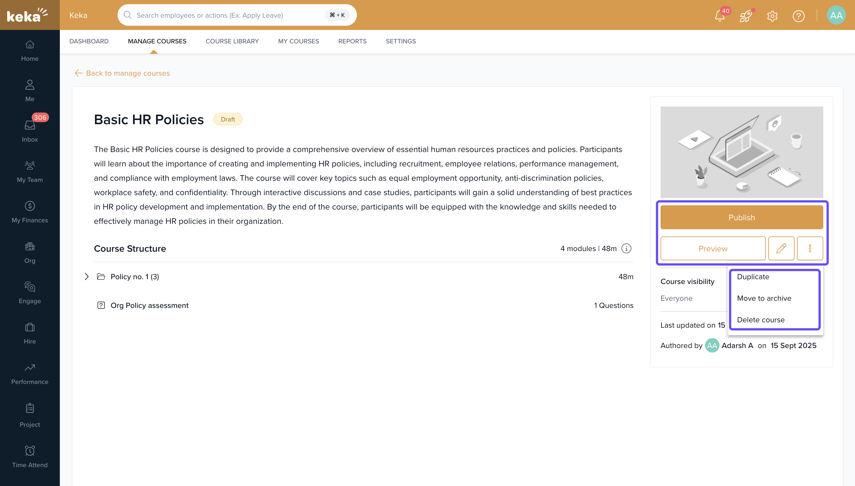 You can edit, archive, or delete courses in Keka Learn at any time. This ensures your learners always have access to the most up-to-date training materials and helps you manage older or outdated courses.
