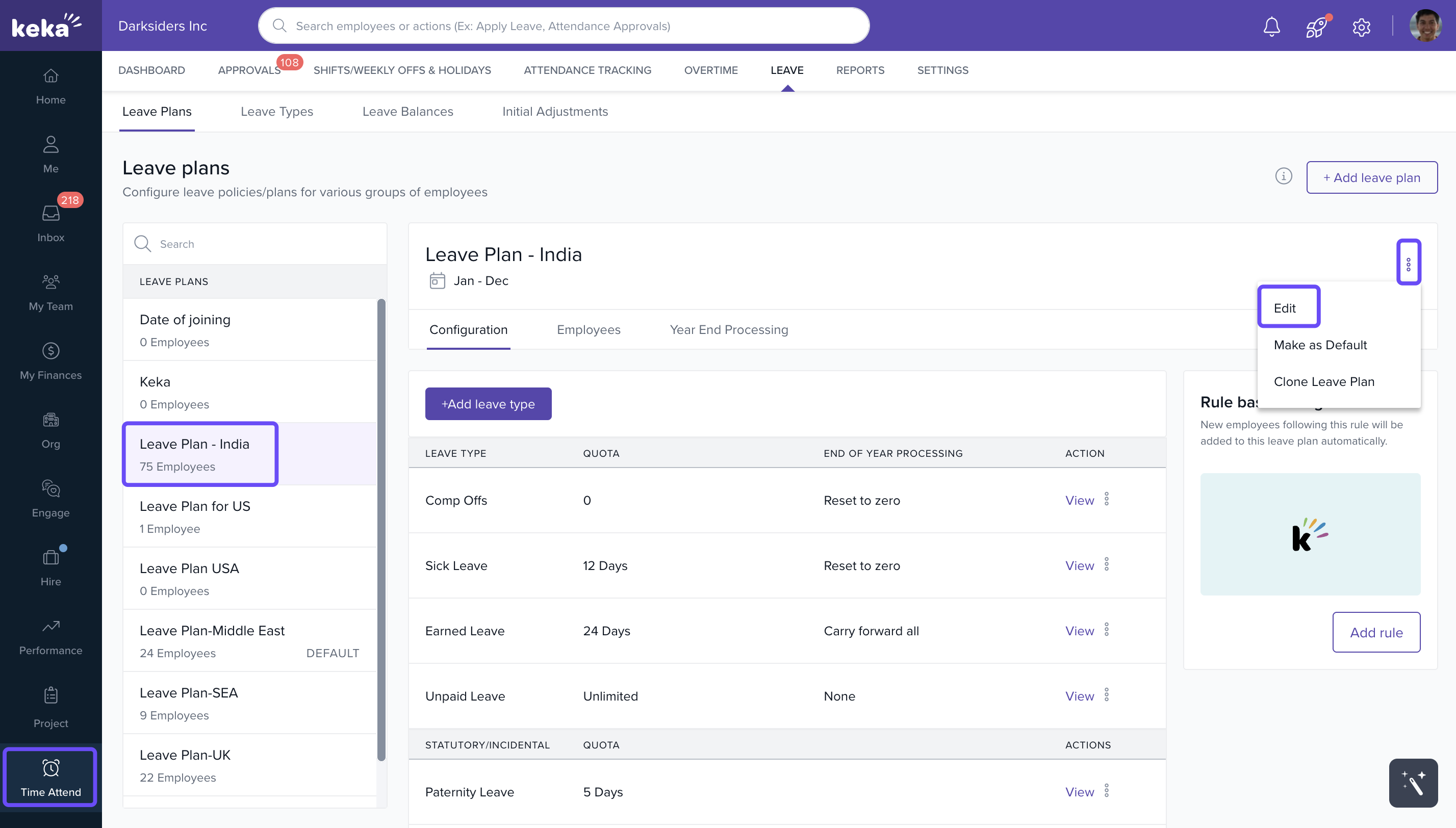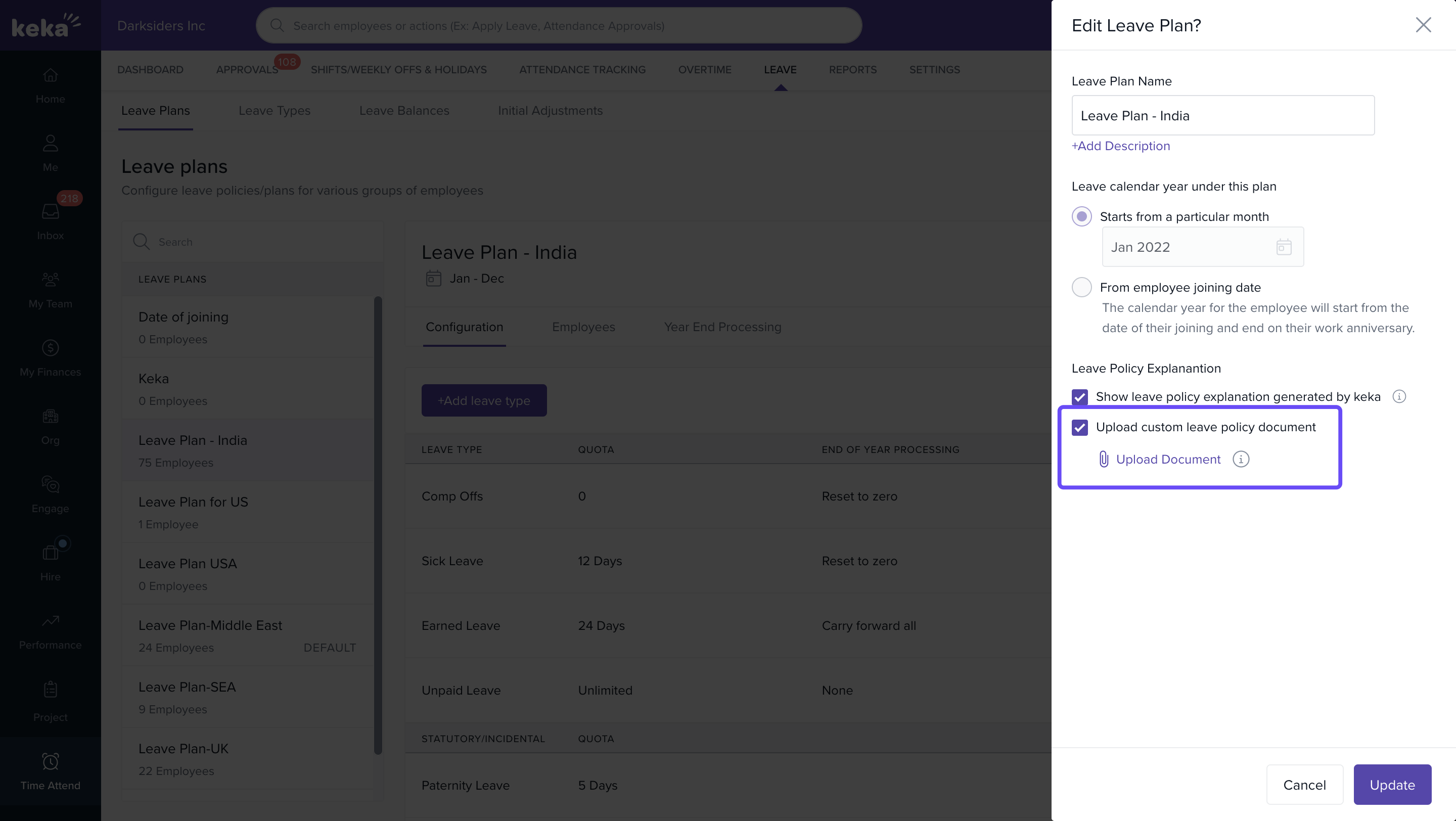 Go to Time Attend.Click on Leave and select Leave Plan.Choose the leave plan you want and click Edit under Options.Select Upload custom leave policy document.Click Upload Document and upload your file.Click Update to save the changes. Related articles Labour Codes 2025: HR & Payroll Compliance Guide for Keka Users Do's and Don'ts during Year End Processing How can an Admin change the leave type/leave dates for an approved leave? Configuring Different Leave Types for a Leave Plan How to check attendance request logs? Comments 0 comments Please sign in to leave a comment.