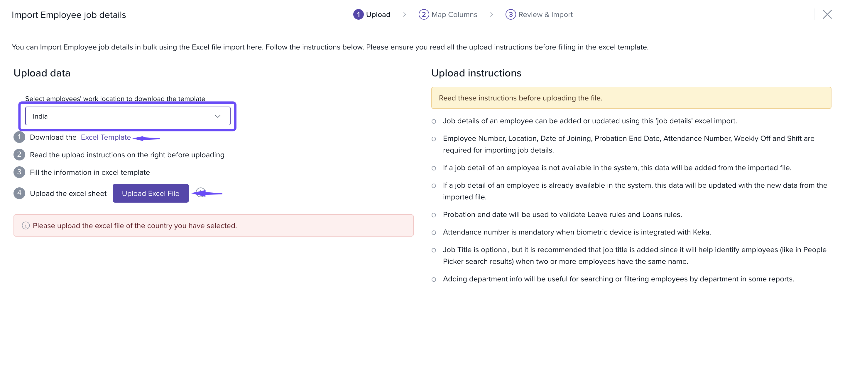 - Select the work location and download the Excel Template.