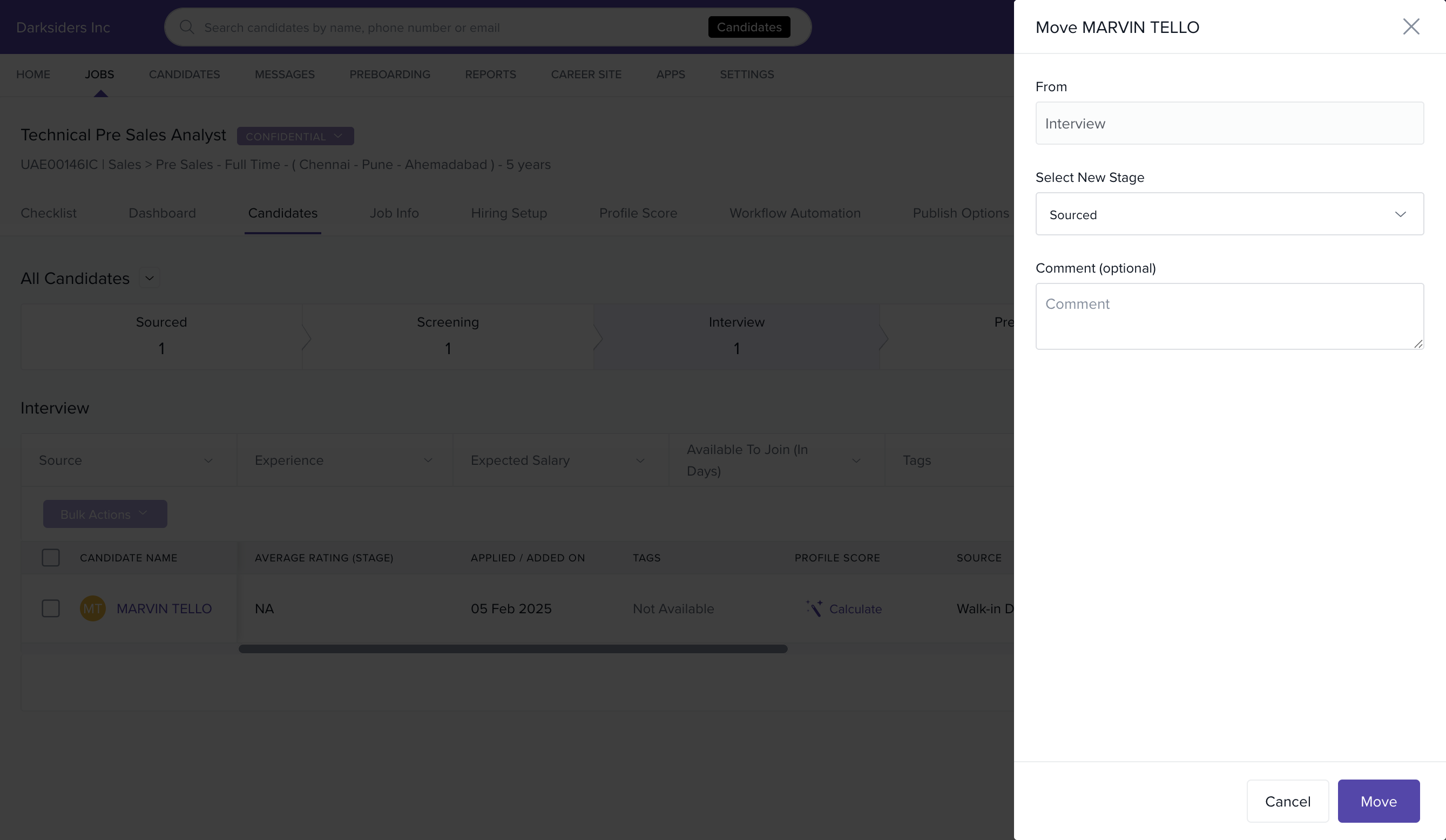 - On the overlay window, Select New stage for the candidate, add a comment if you wish to & click on Move.