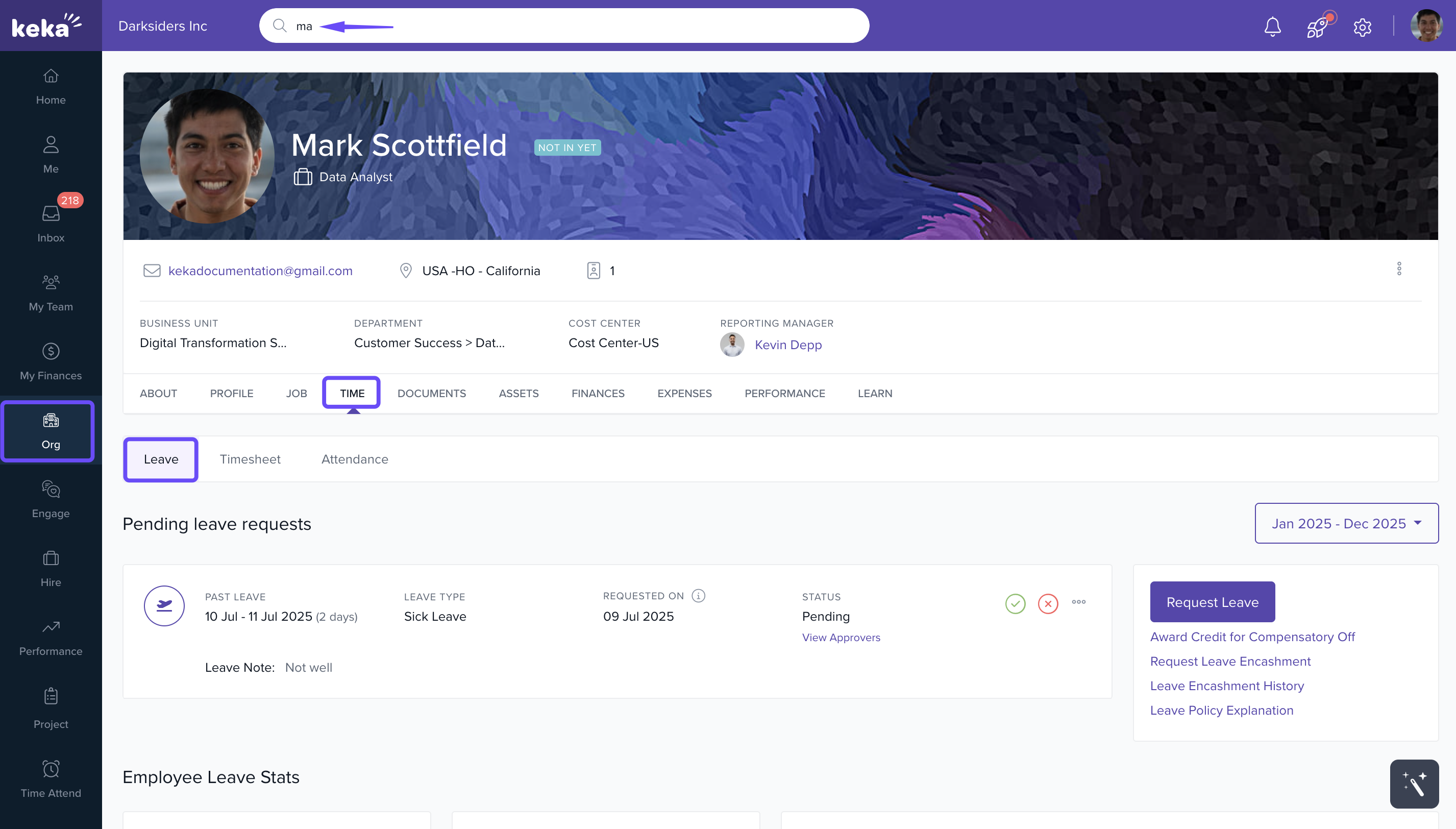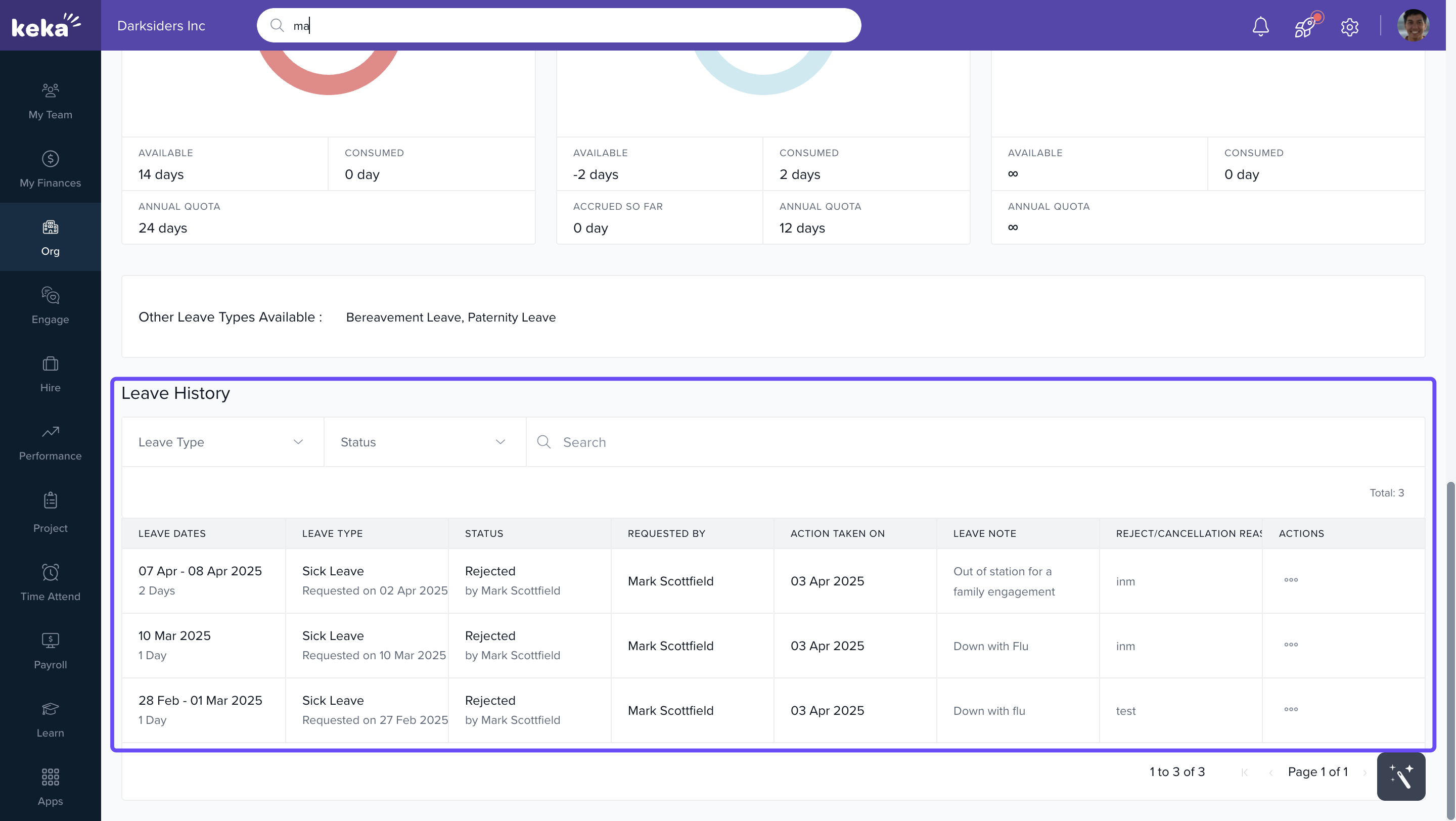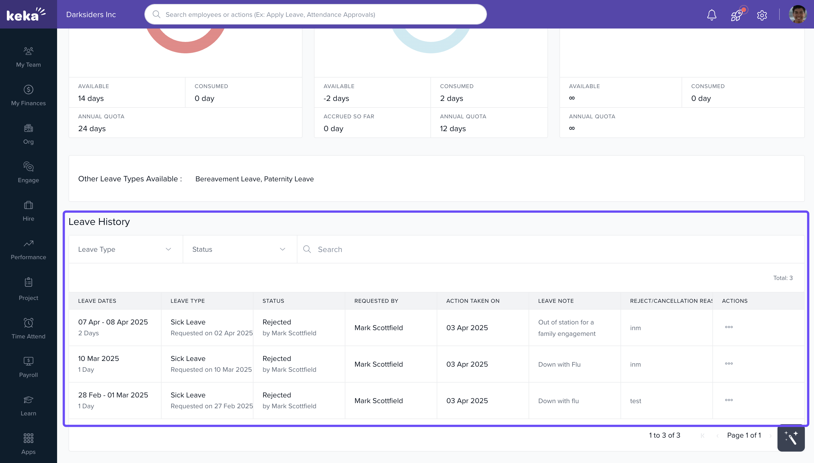 - Scroll down to view the Leave History, which includes all leaves and any penalties.