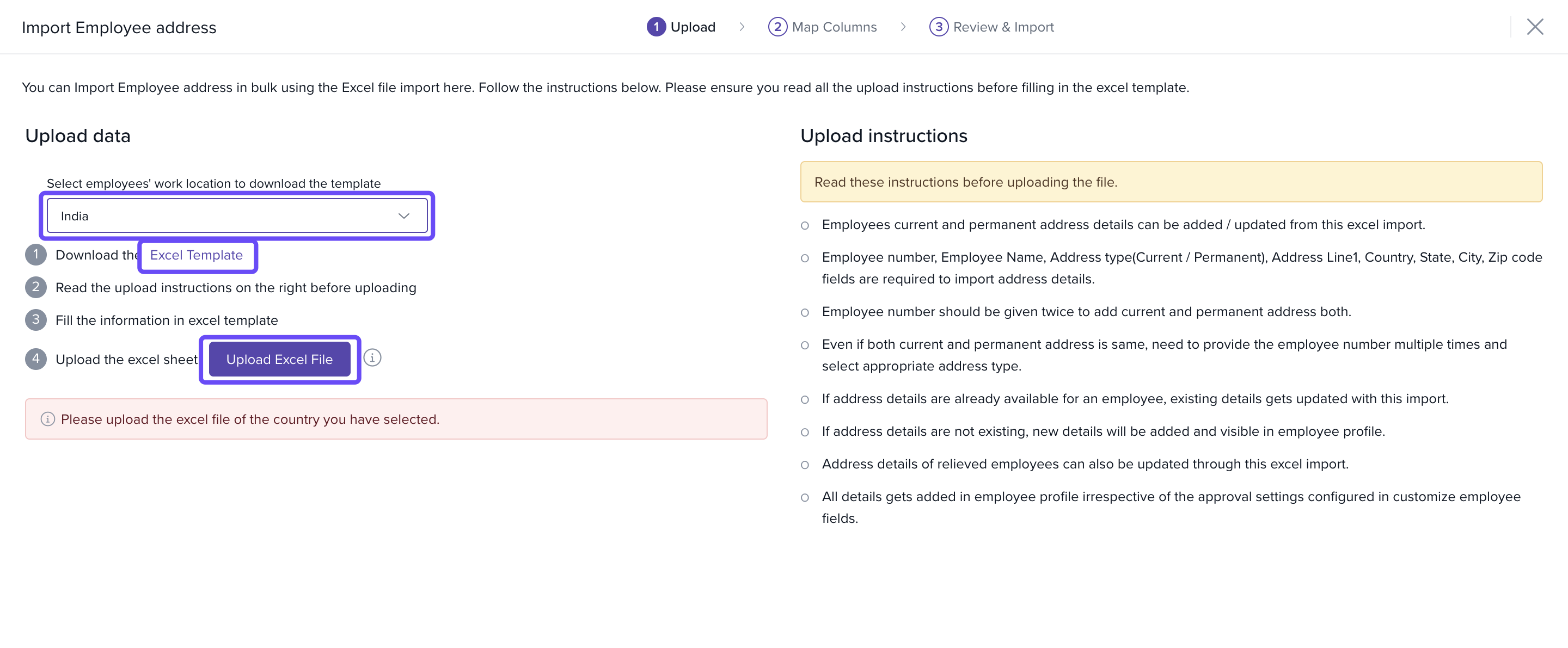 - Download the Excel Template and fill in the updated address details for employees.