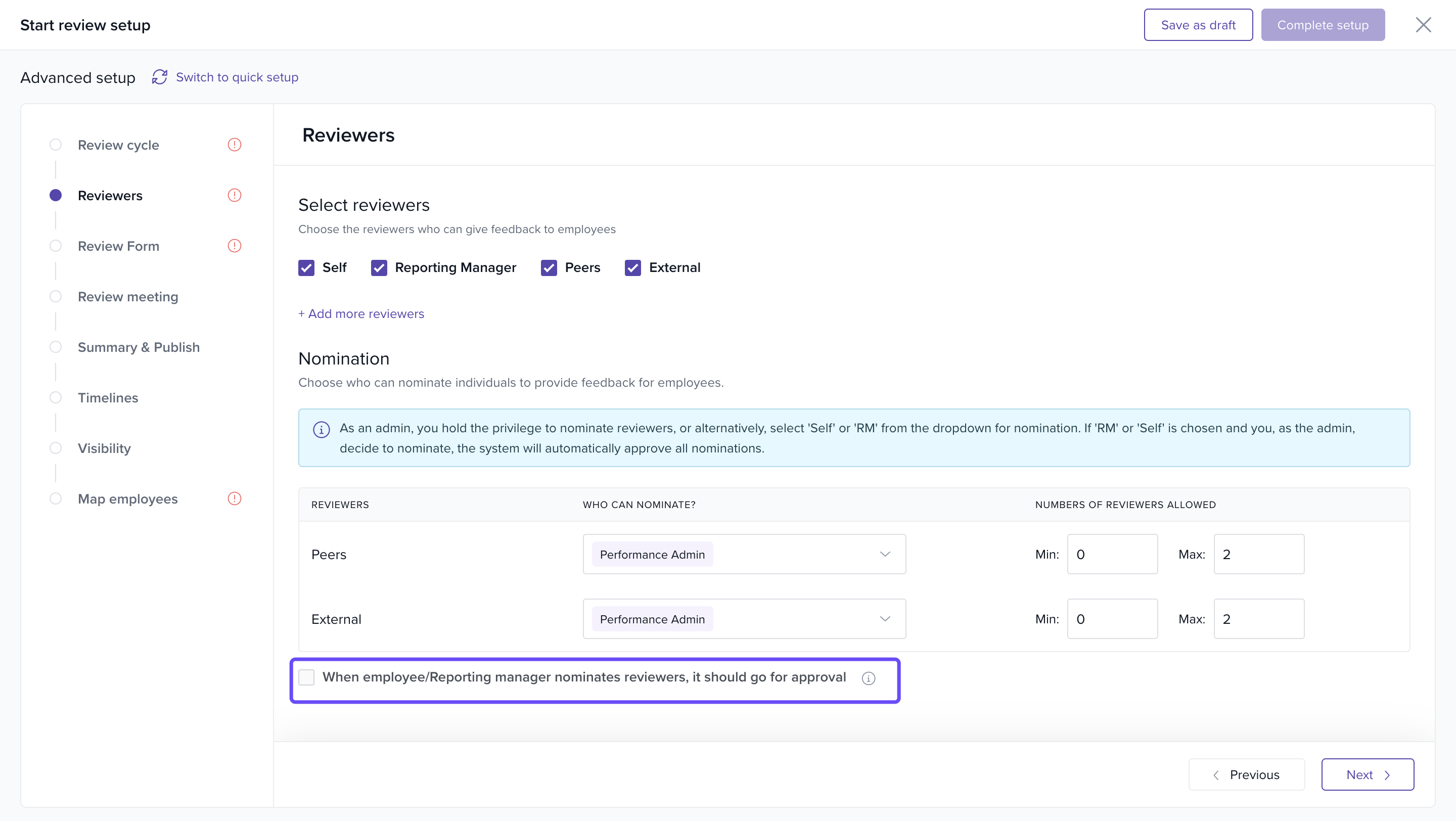"When employee/reporting manager nominates reviewers, it should go for approval."Select one or more approvers who will review and approve these nominations.