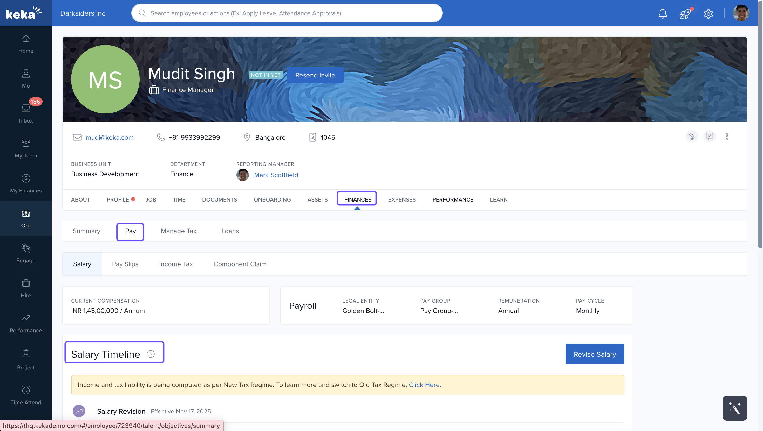In the Salary Timeline section, find the current salary and assigned bonuses.