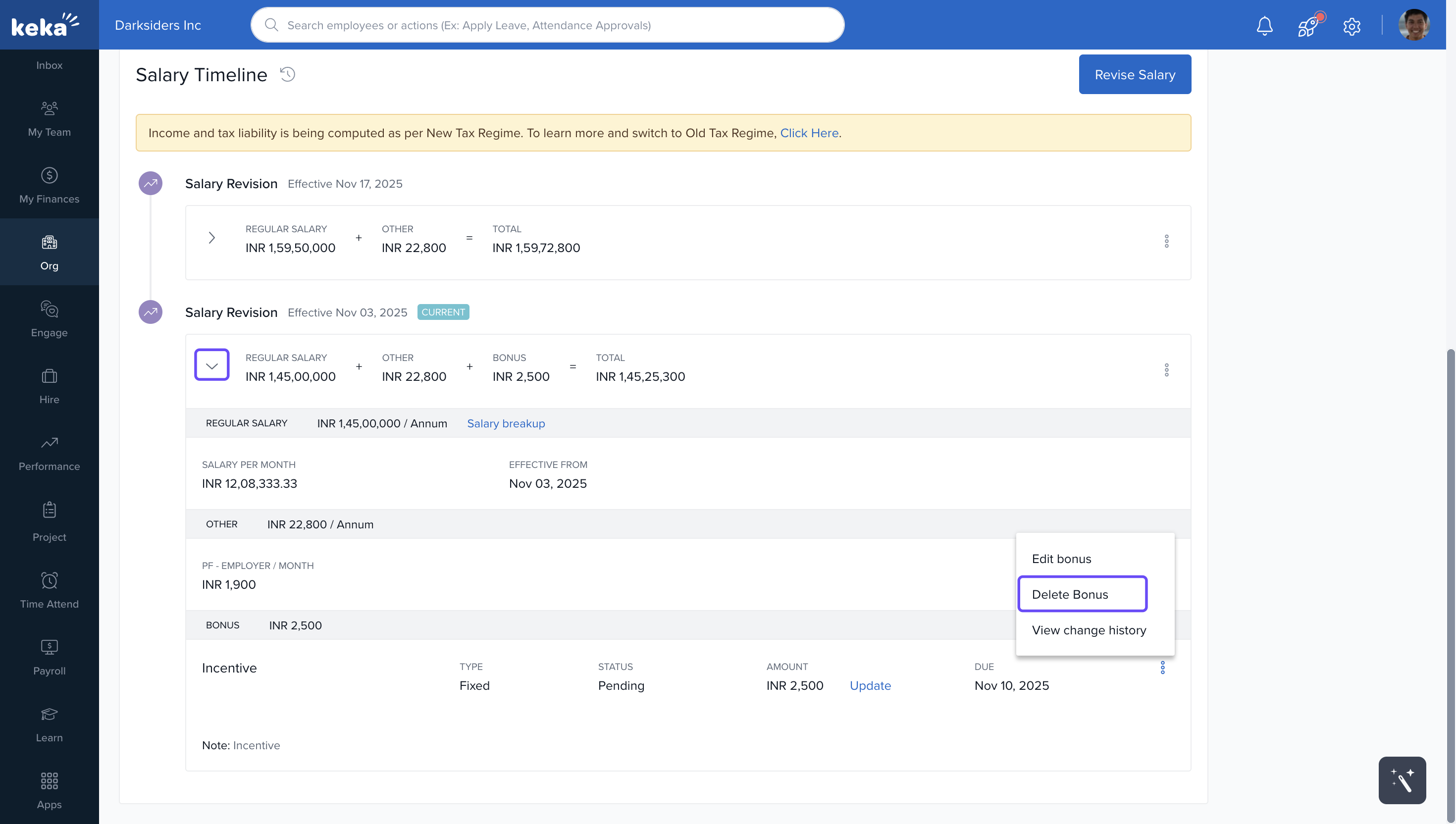 Bonuses are extra payments made by the employer, added to the Cost to Company (CTC). Employers may need to edit or delete the bonus type, amount, or date before paying it out, especially if the employee is not eligible for the bonus (e.g., termination before probation completion).