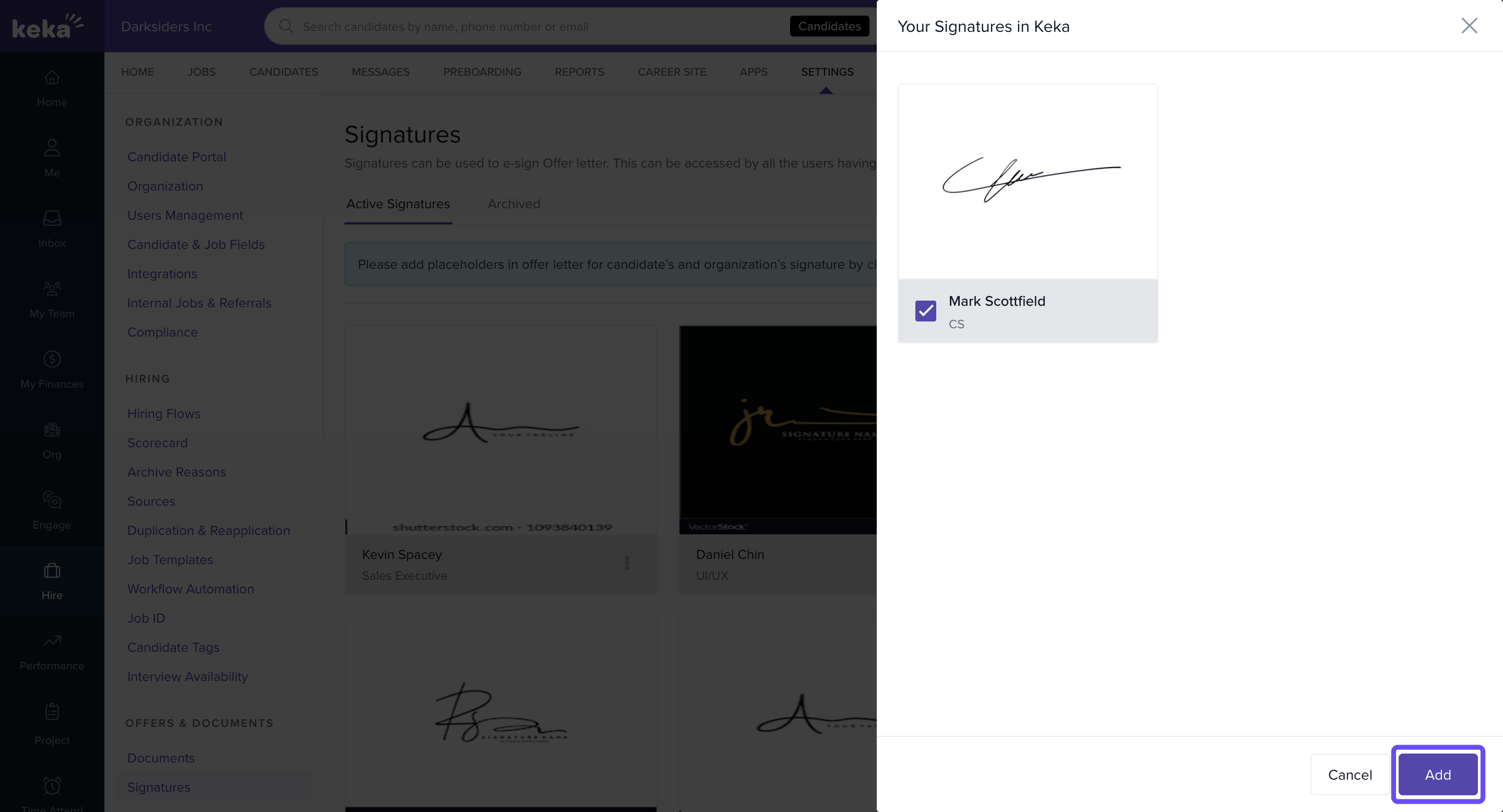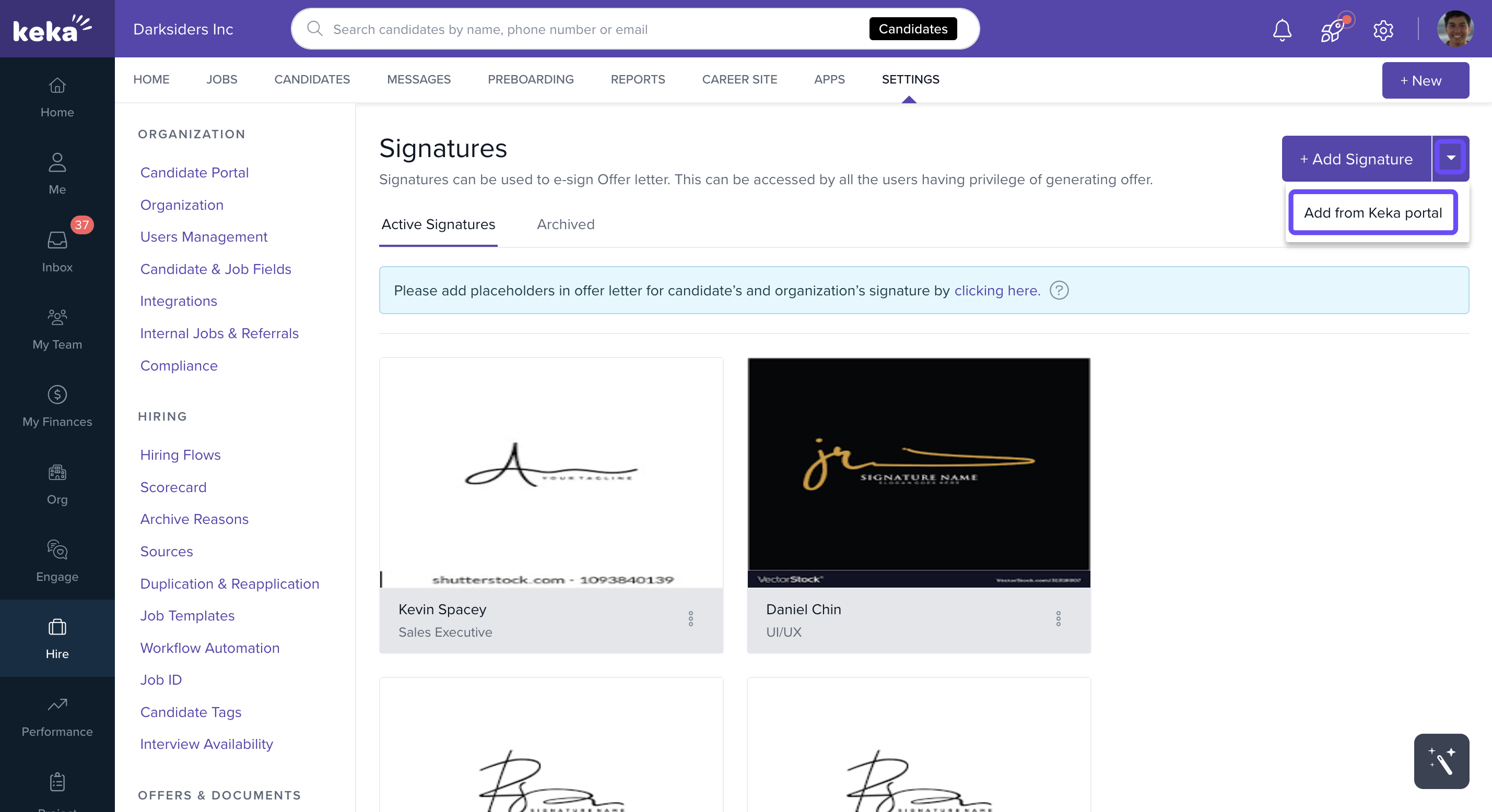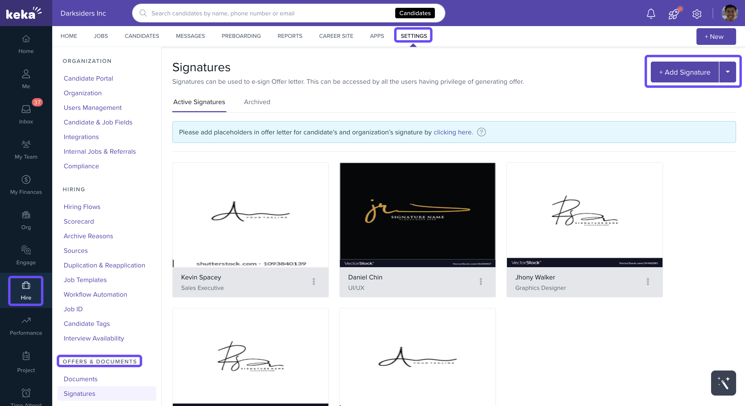 Go to Settings → Offers & Documents → Signatures in your Keka Hire portal.