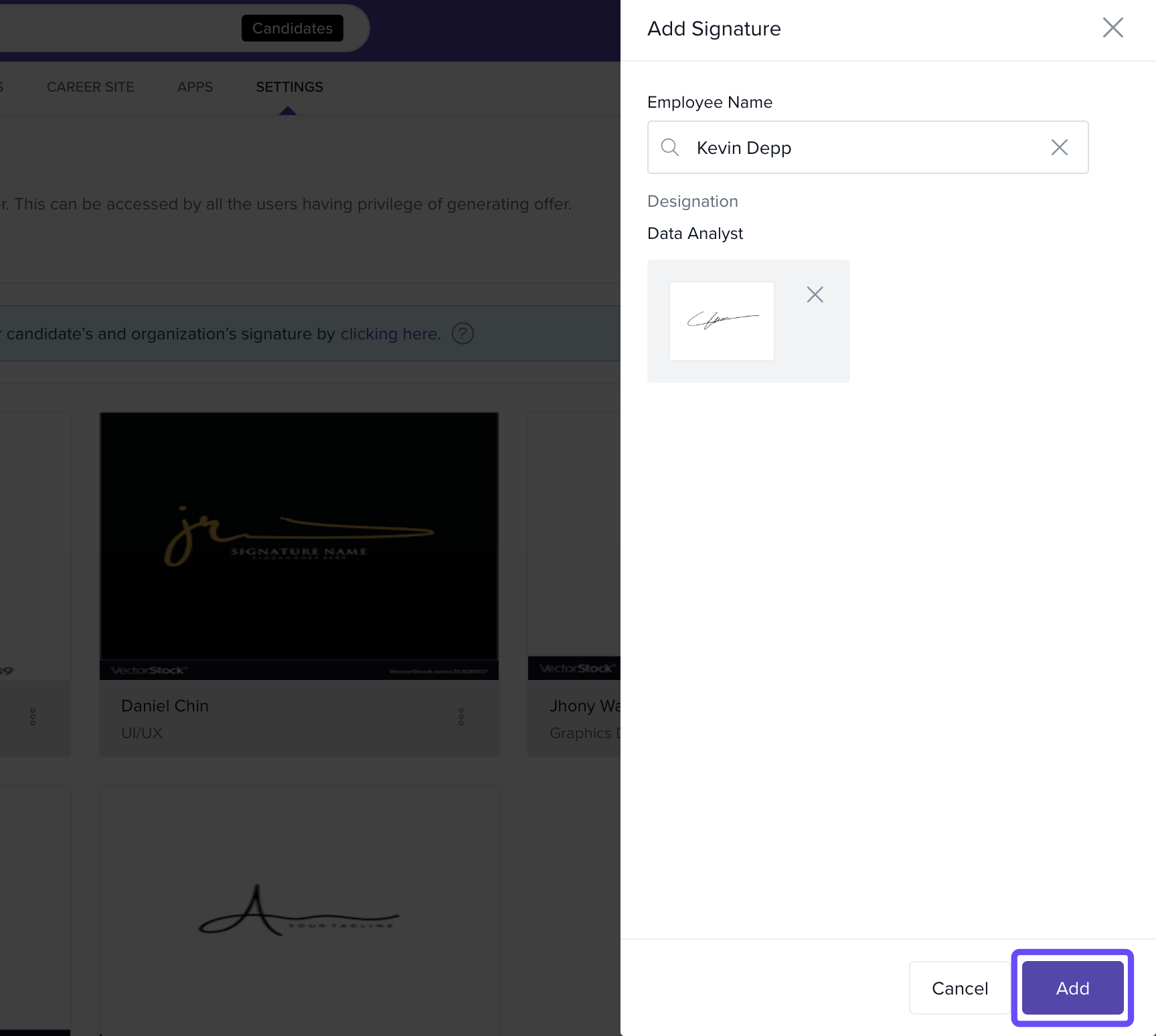 Once added, this signature will be available for use in offer letters and other official documents sent from Keka Hire.
