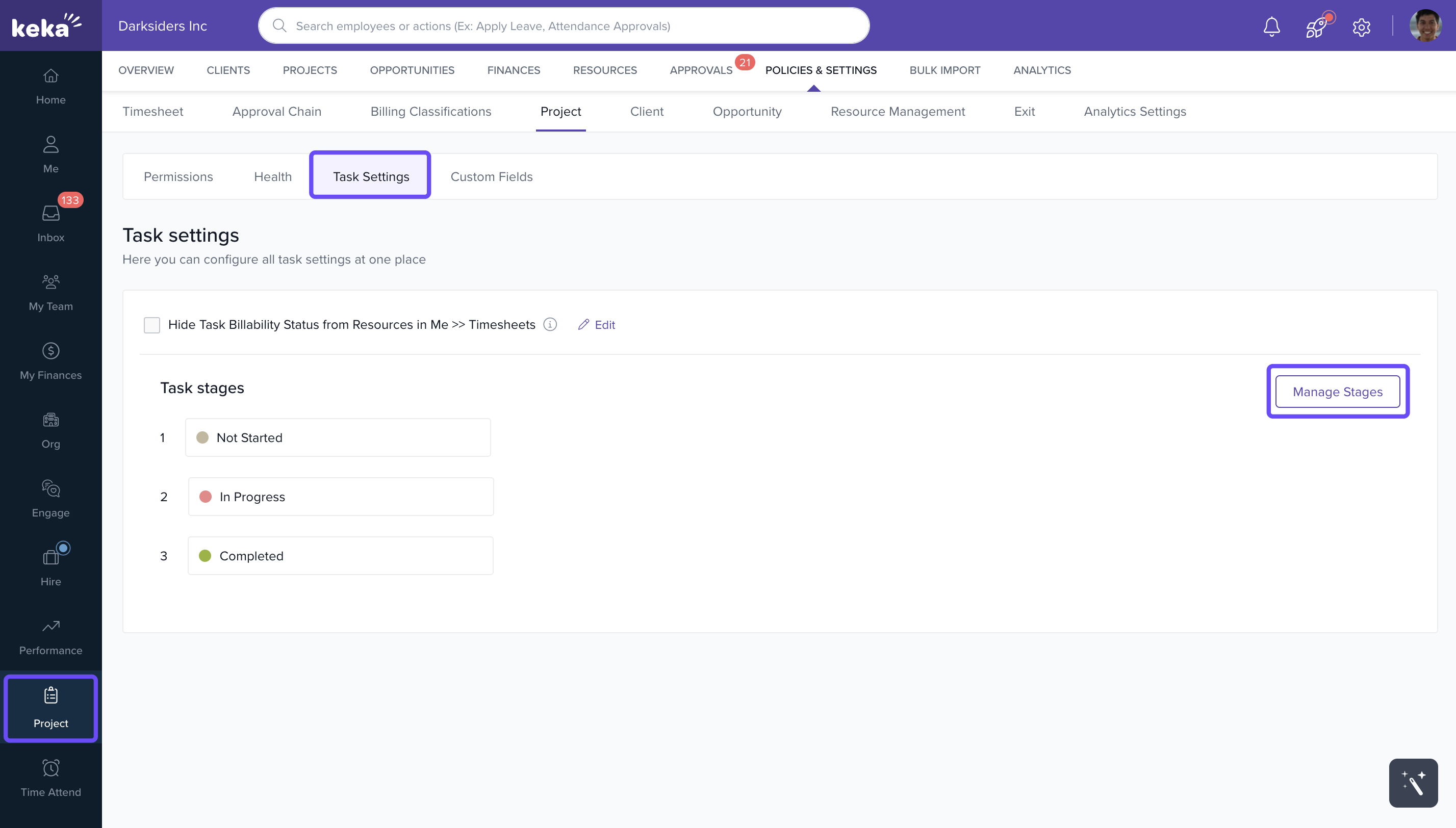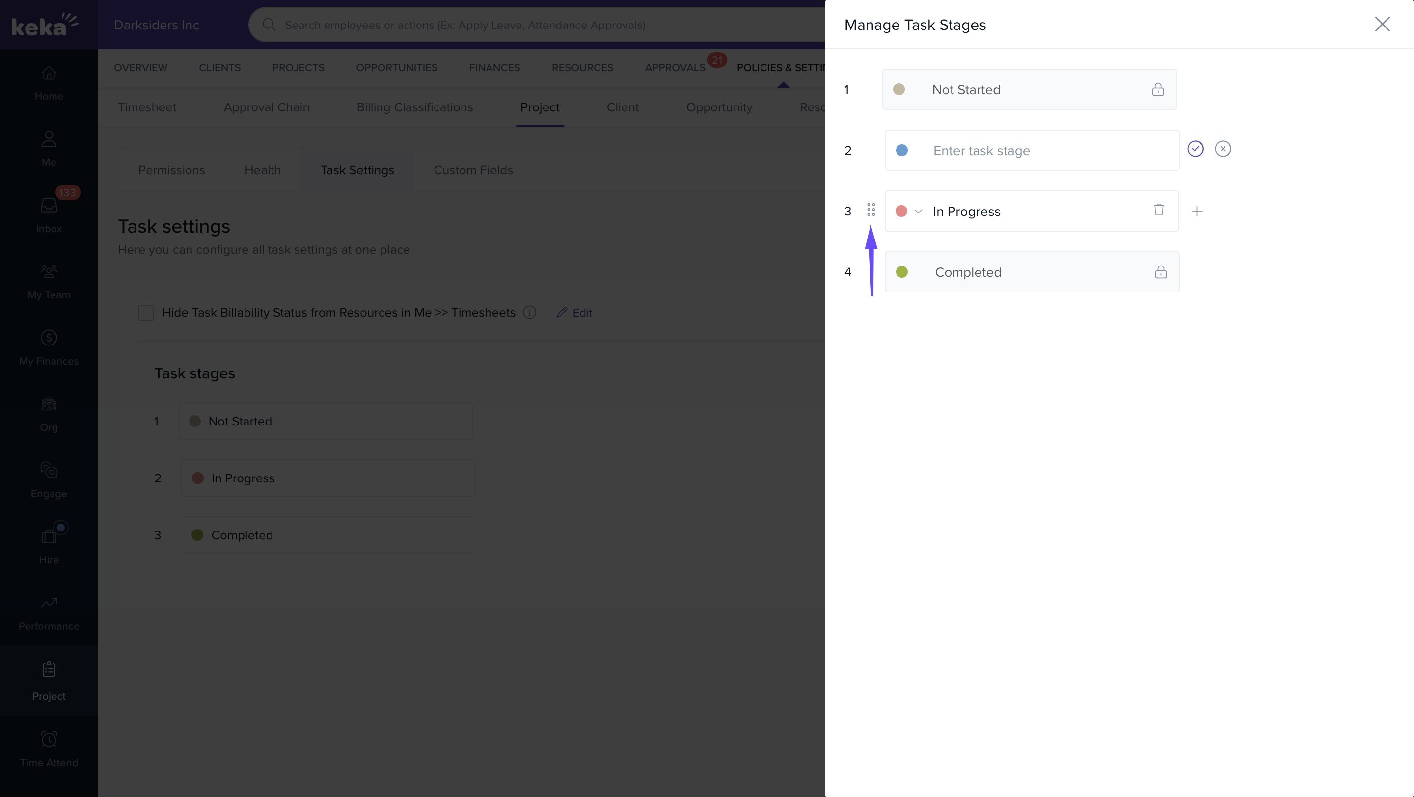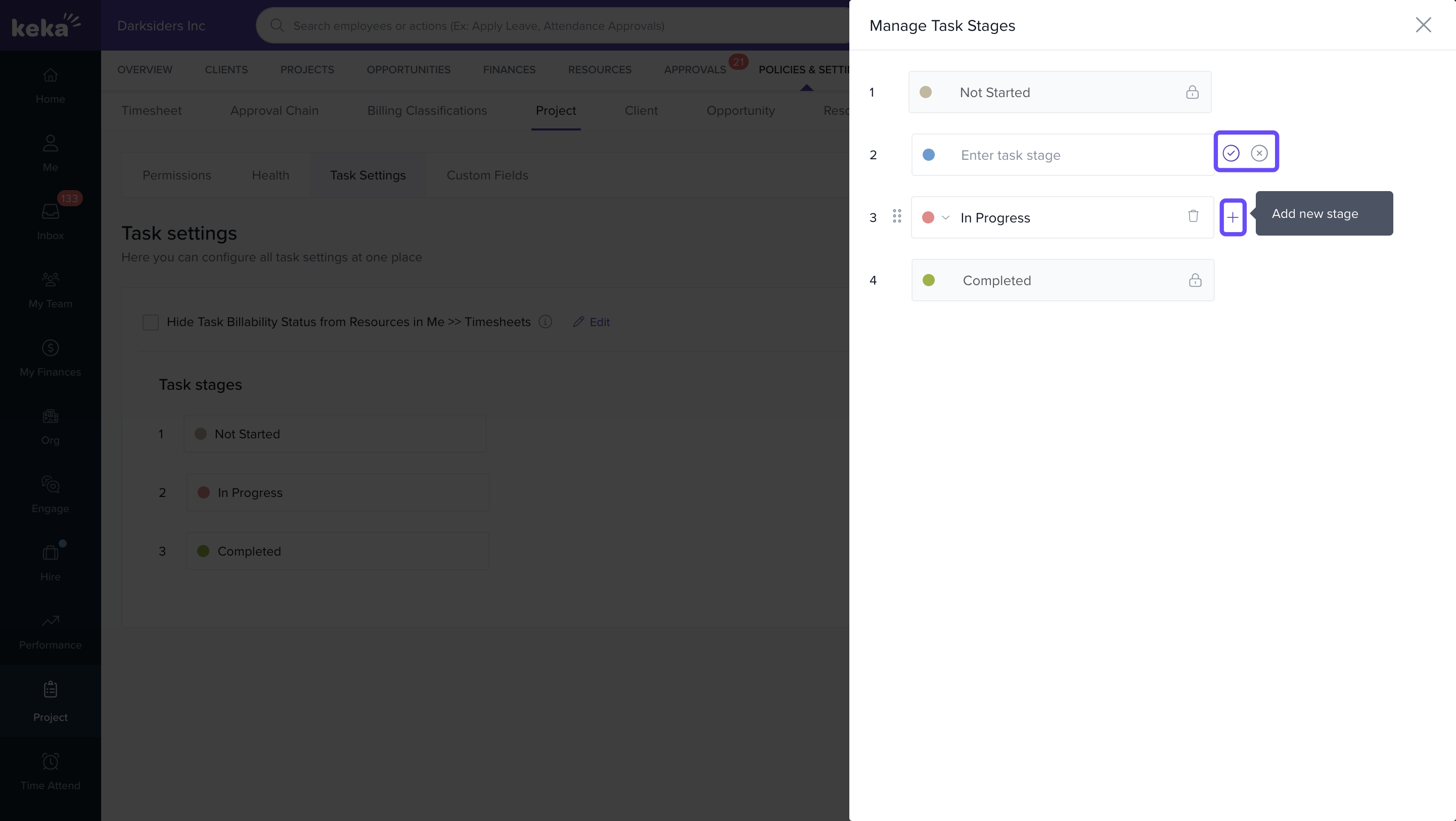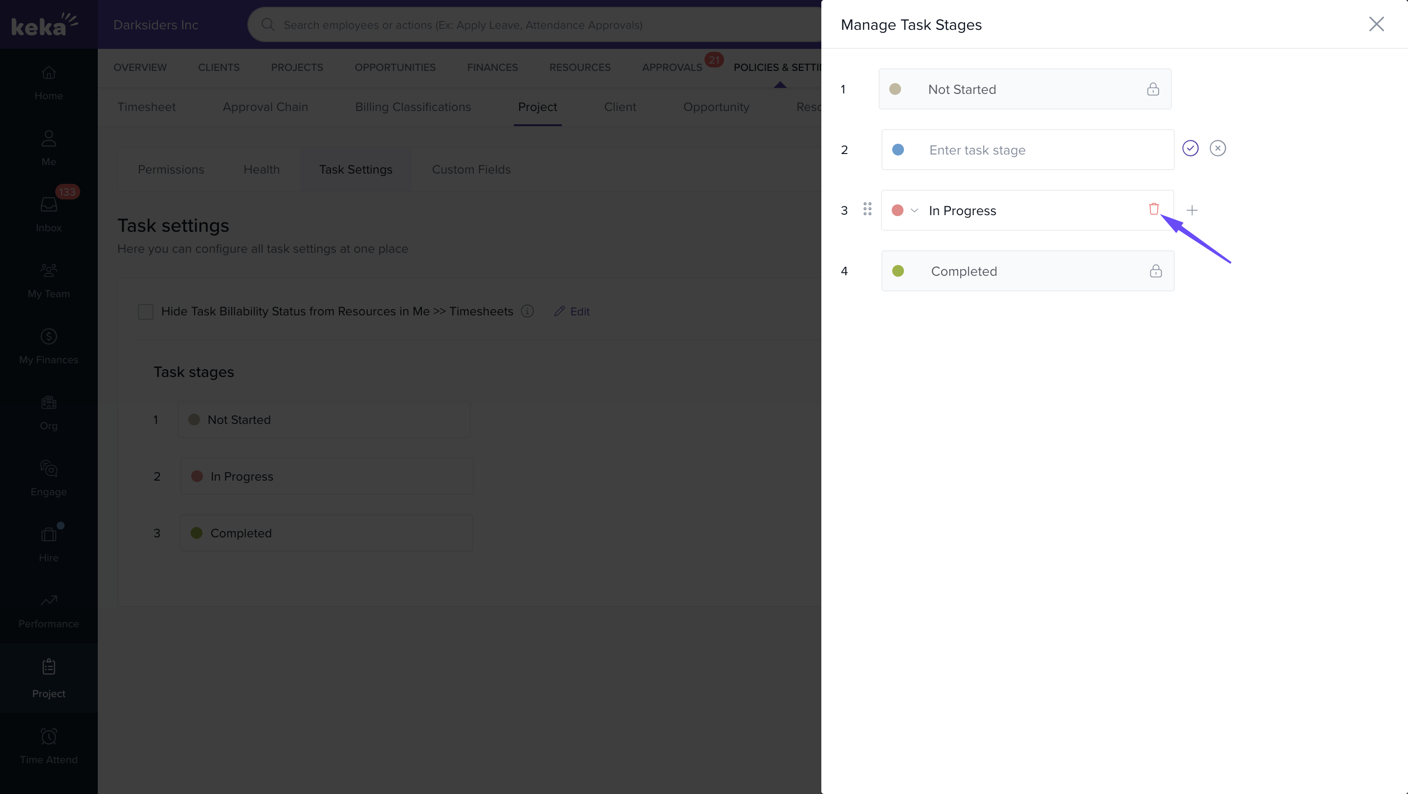 You’ll see the list of task stages that are currently configured in Keka PSA.
