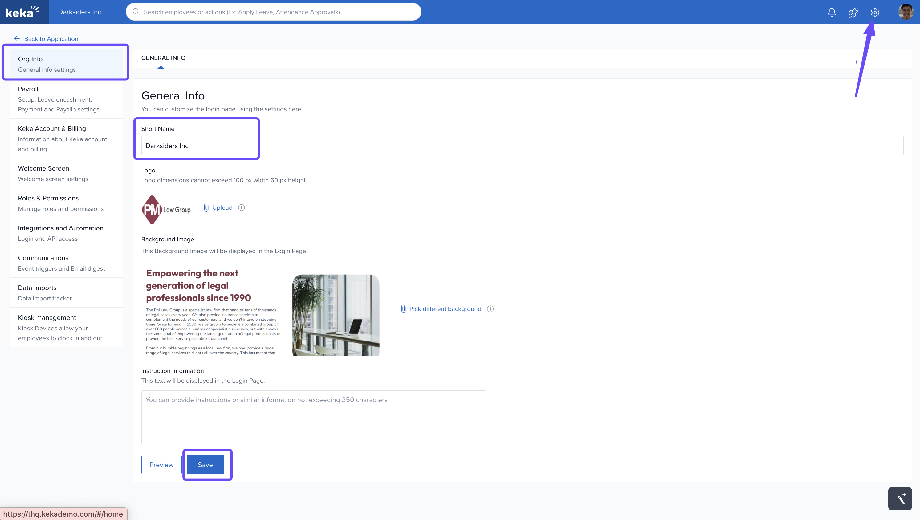 Organizations often use a shorter name for convenience. Keka allows you to configure a short name for your organization that will appear across the portal.