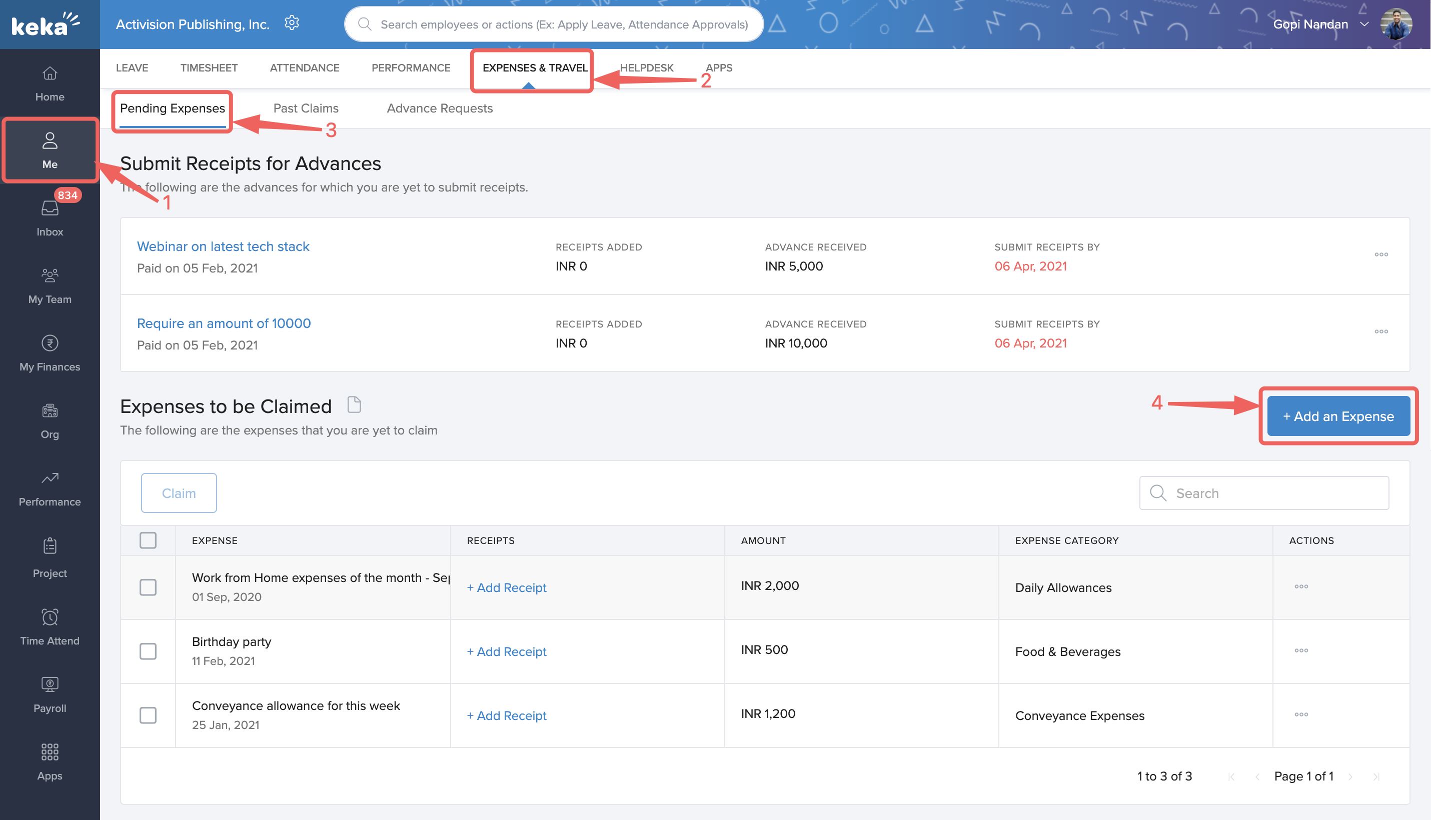 For Employees to claim expenses, navigate to Me (1) from the left navigation pane. Select the Expense & Travel (2) tab. Make sure you're on the Pending Expenses (3) tab and then click on +Add an Expense.
