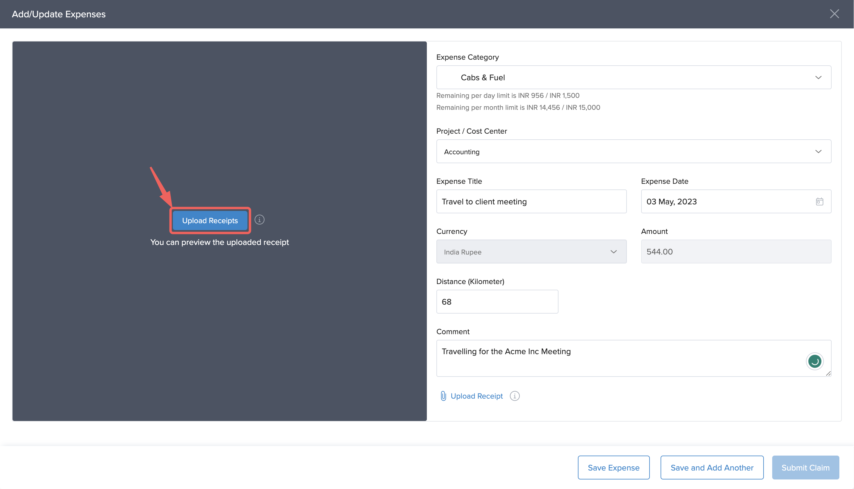 Also add an expense title, the date the expense was incurred, and the currency and amount. Depending on the expense category, you may have to enter additional details such as distance. You will also have to upload a receipt to support your expense claim. Click on the Upload Receipts button to upload the bill or receipt.