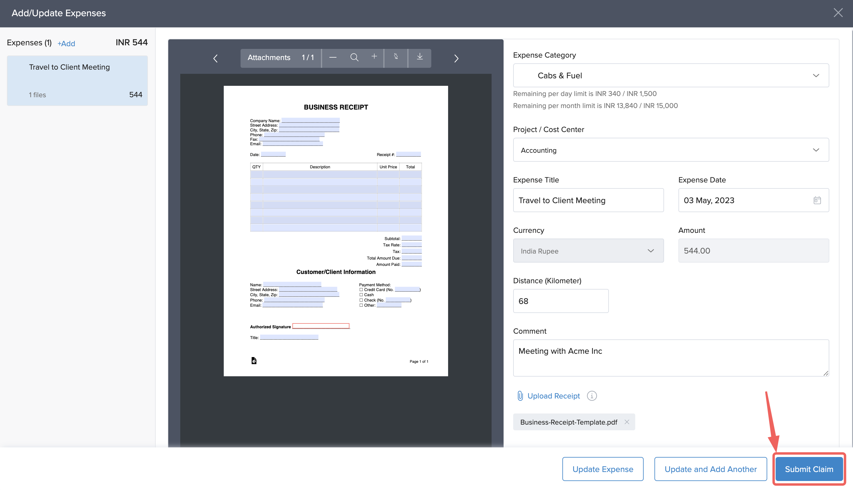 Once you have added the details and uploaded the receipt, click on Update Expense. You can update more than one expense under the same claim by clicking the Update and Add Another button.