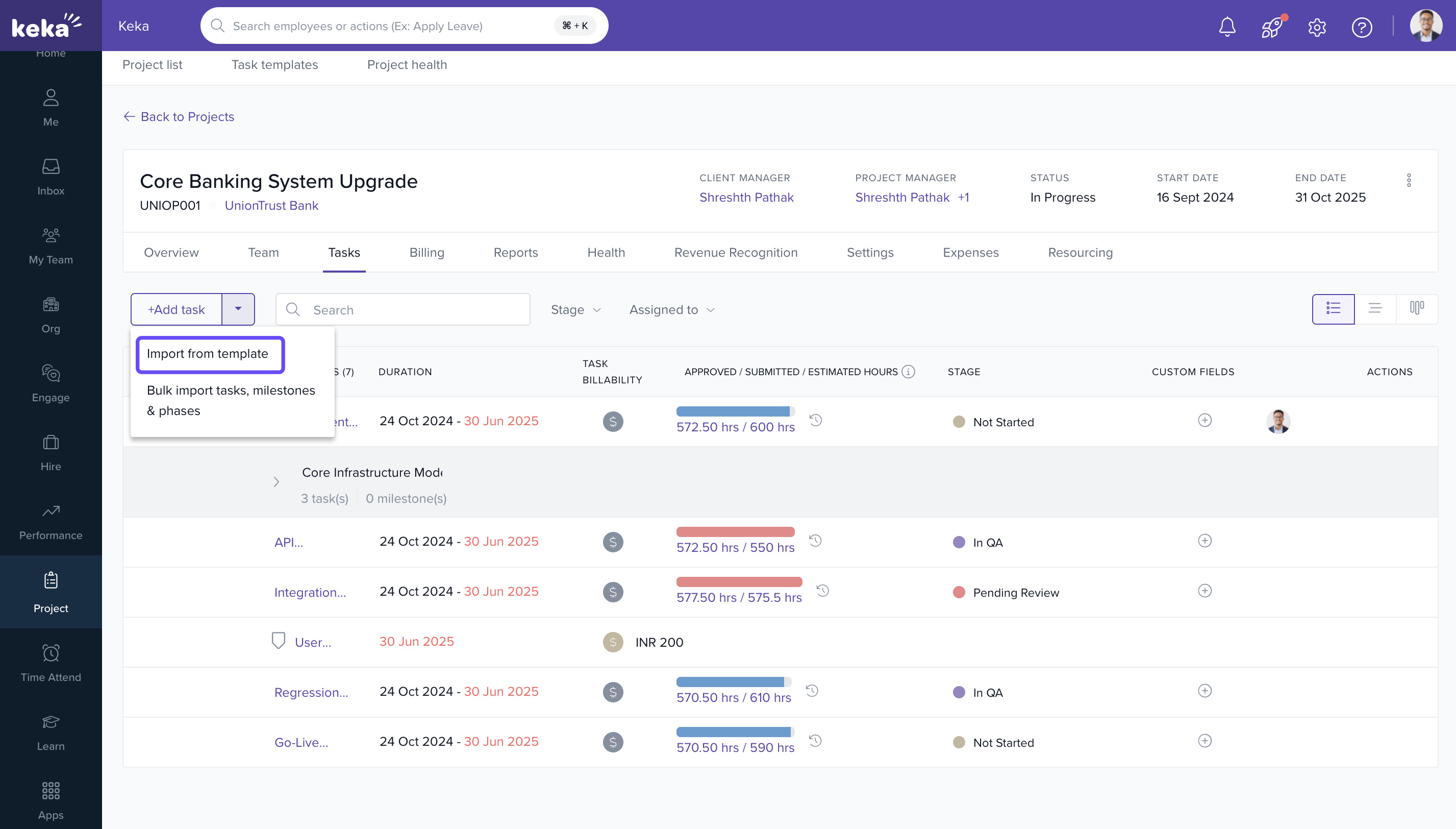- Click the dropdown beside Add Task and select Import from Template.