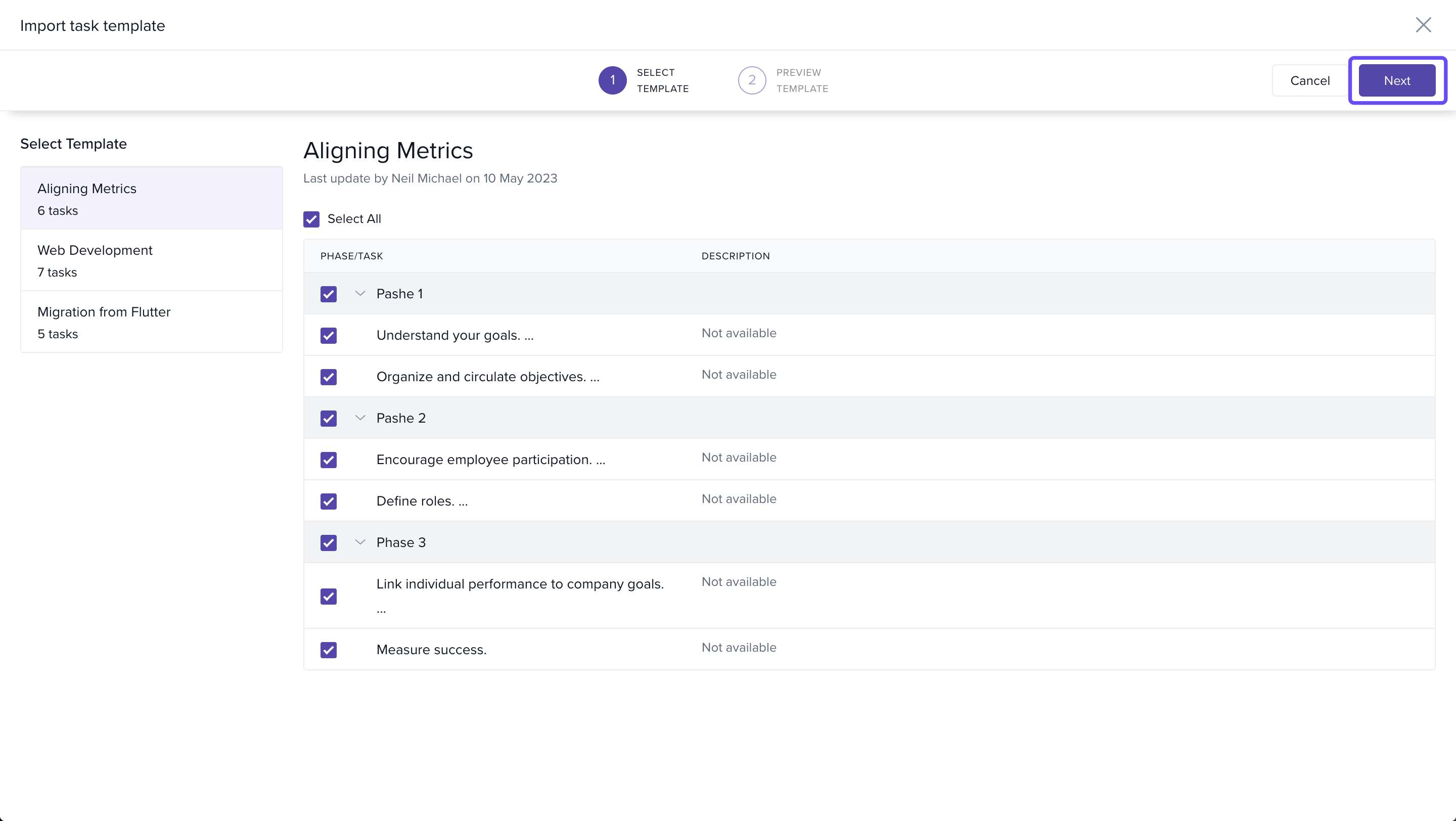- Check the boxes next to tasks you want to import.