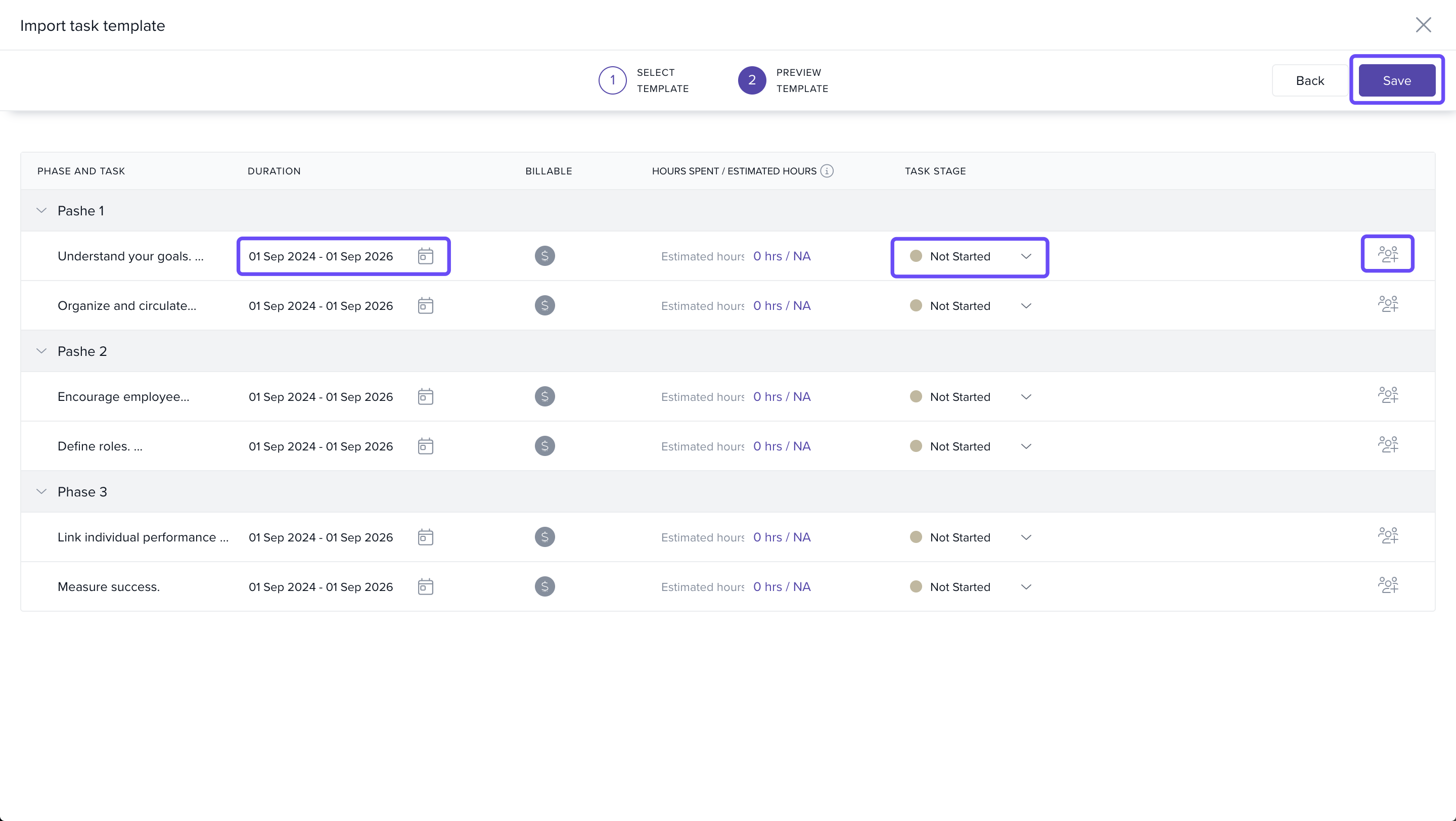 - Click Save to import all selected tasks into the project.
