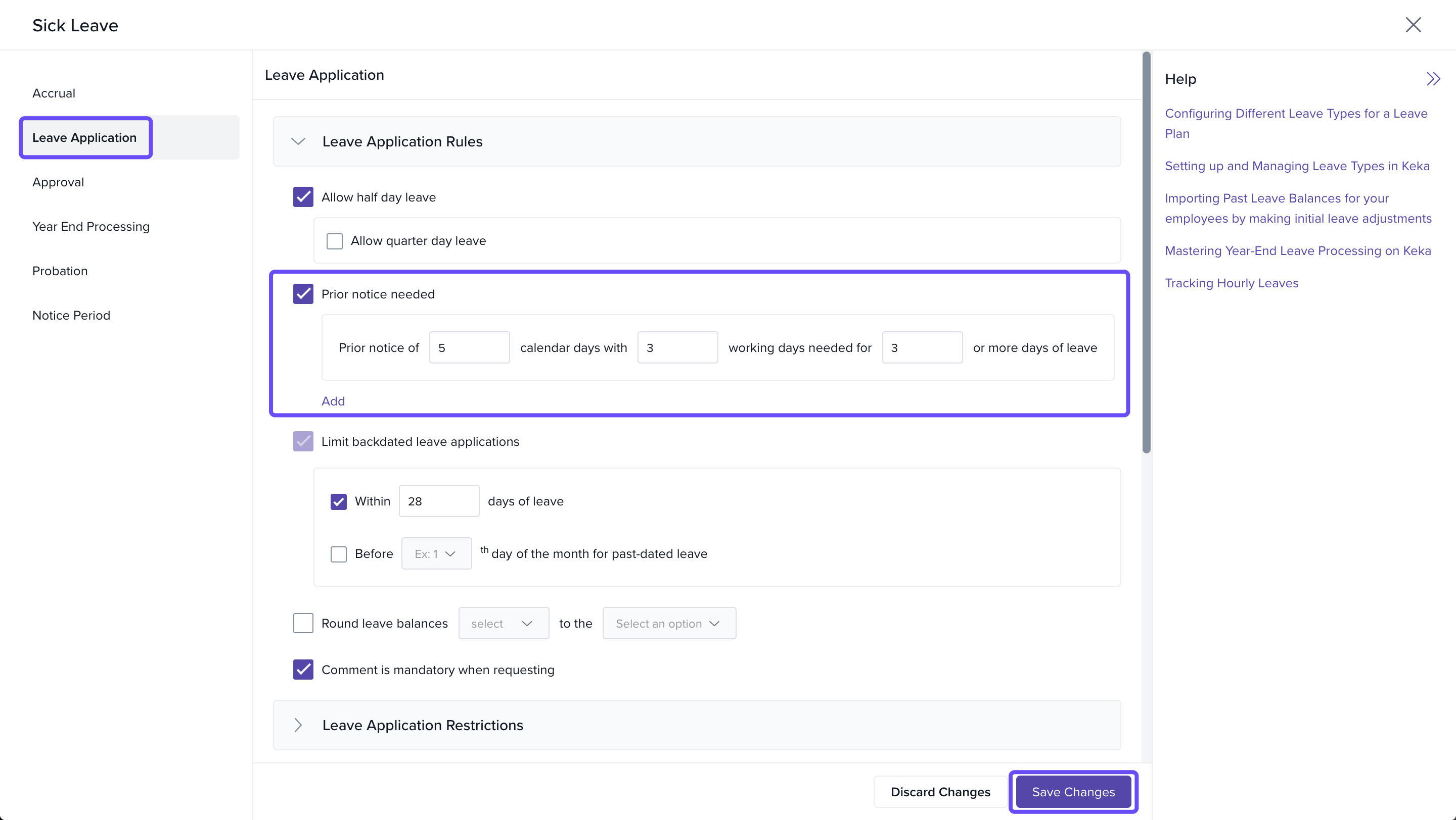 - Enter the number of leave days that require prior notice for both working days and total calendar days.