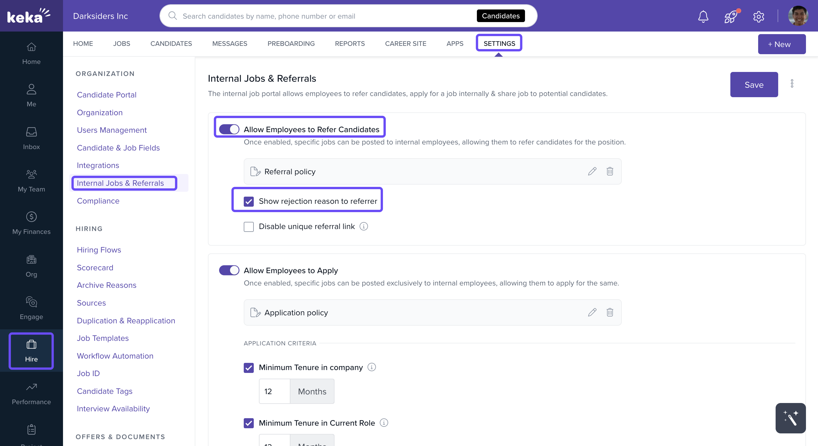Go to Hire → Settings → Internal Jobs & Referrals.