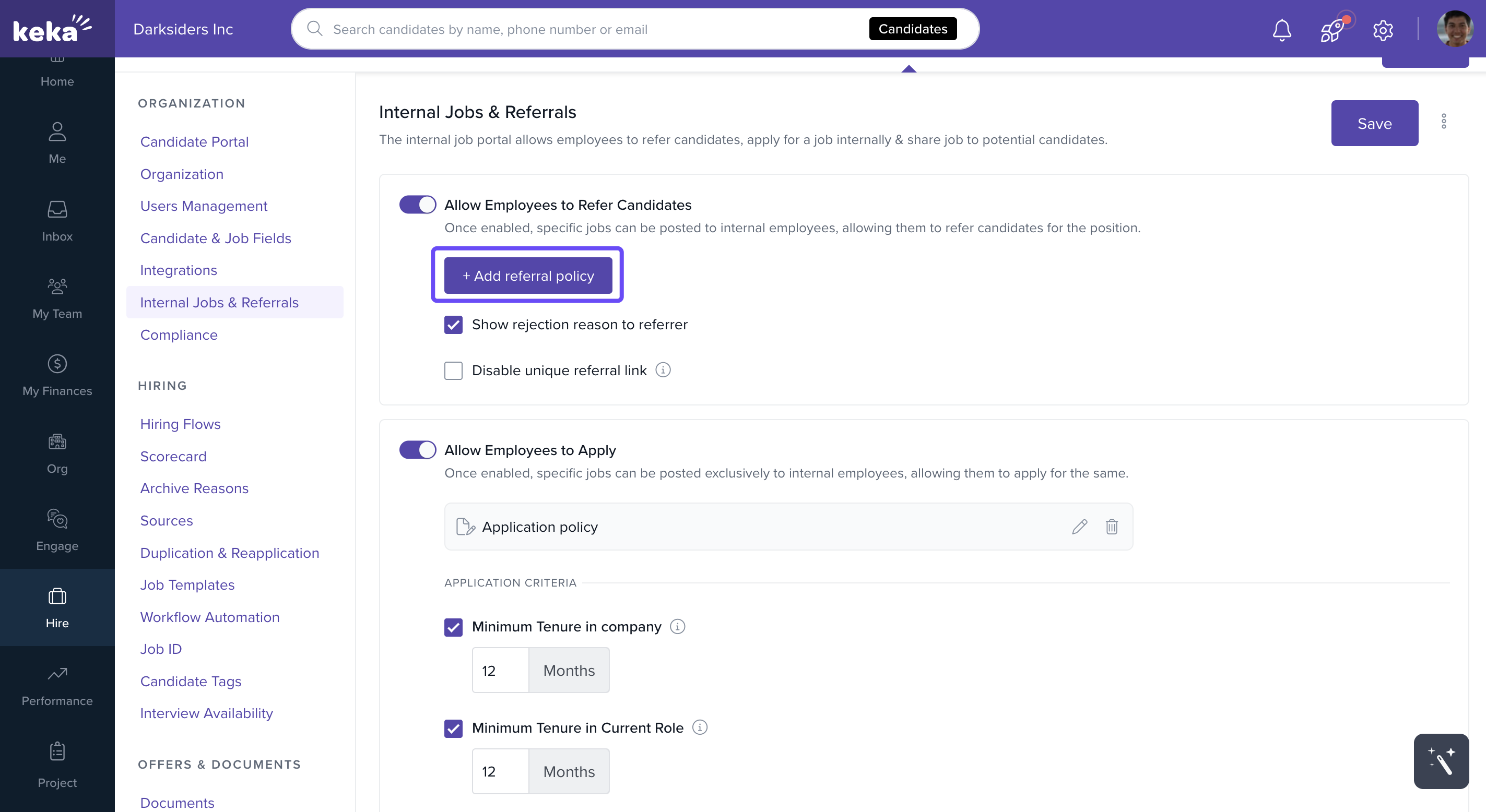 Use referral policies to clearly outline eligibility, bonus rules, or disqualifying criteria, and note that only jobs with the referral checkbox enabled will be visible for internal referrals.