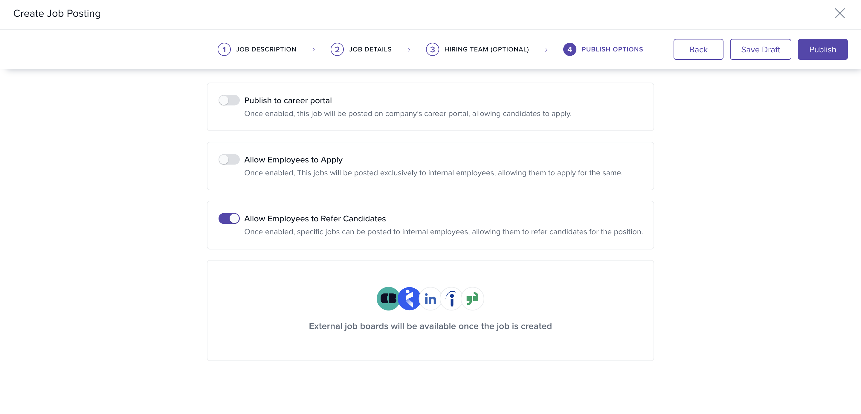 In the Publish section of the job creation flow, check the box Allow Employees to Refer Candidates.