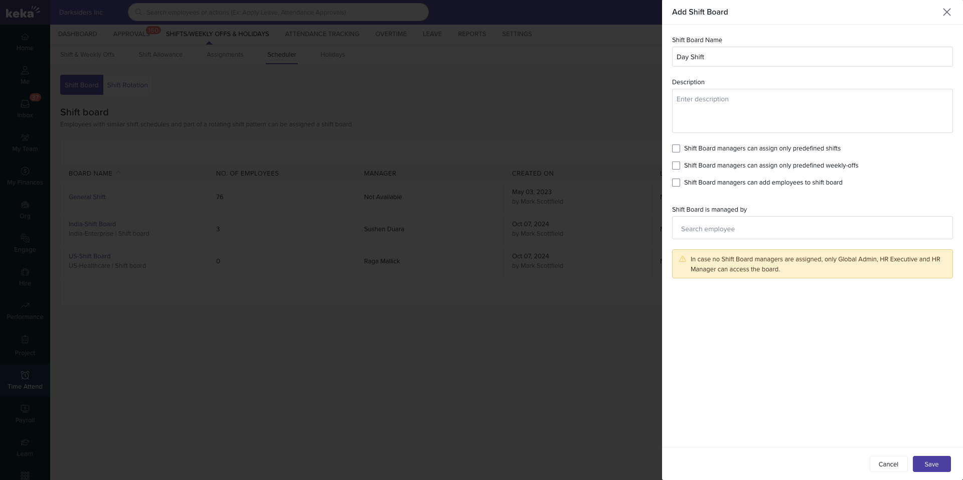 Restrict board managers to predefined shifts or weekly offs.