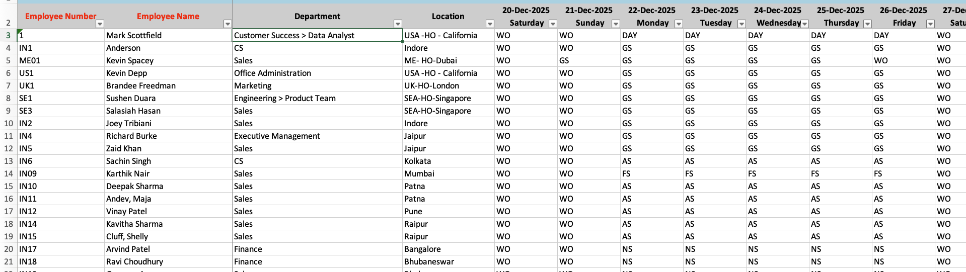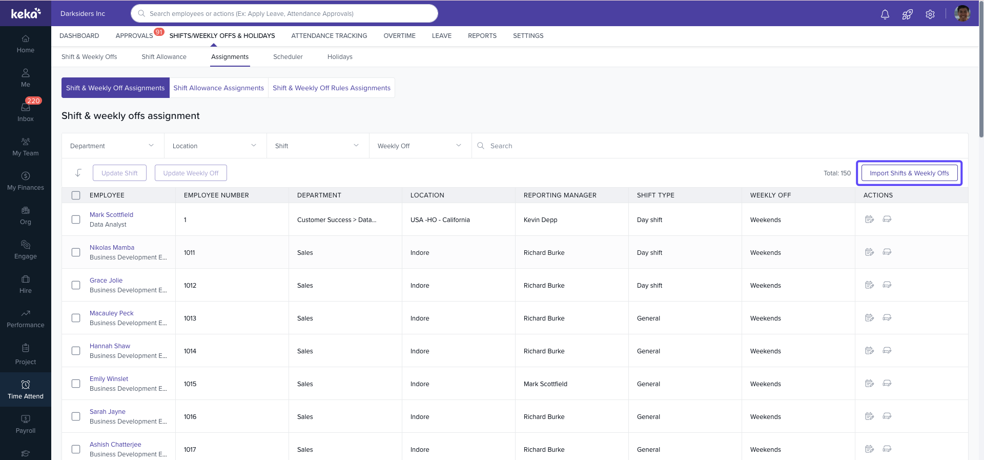 Filter by Department, Location, Business Unit, Shift, or Weekly Off.