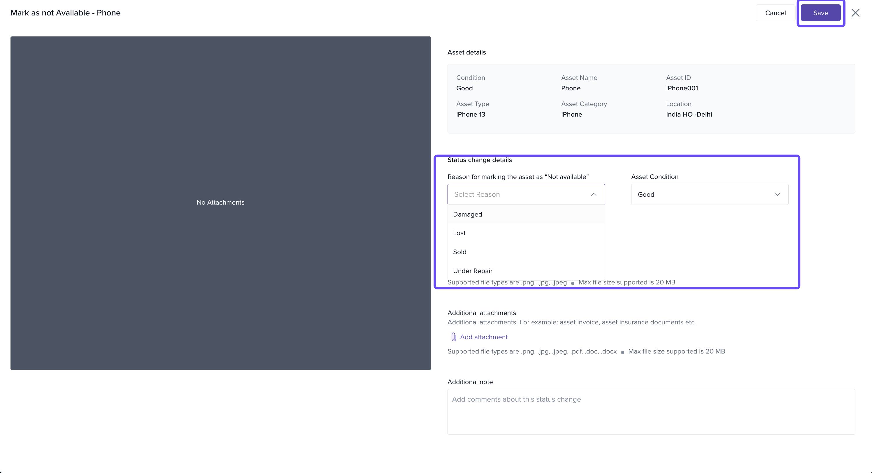 The asset’s status will now be updated as unavailable, along with the reason and any notes provided.