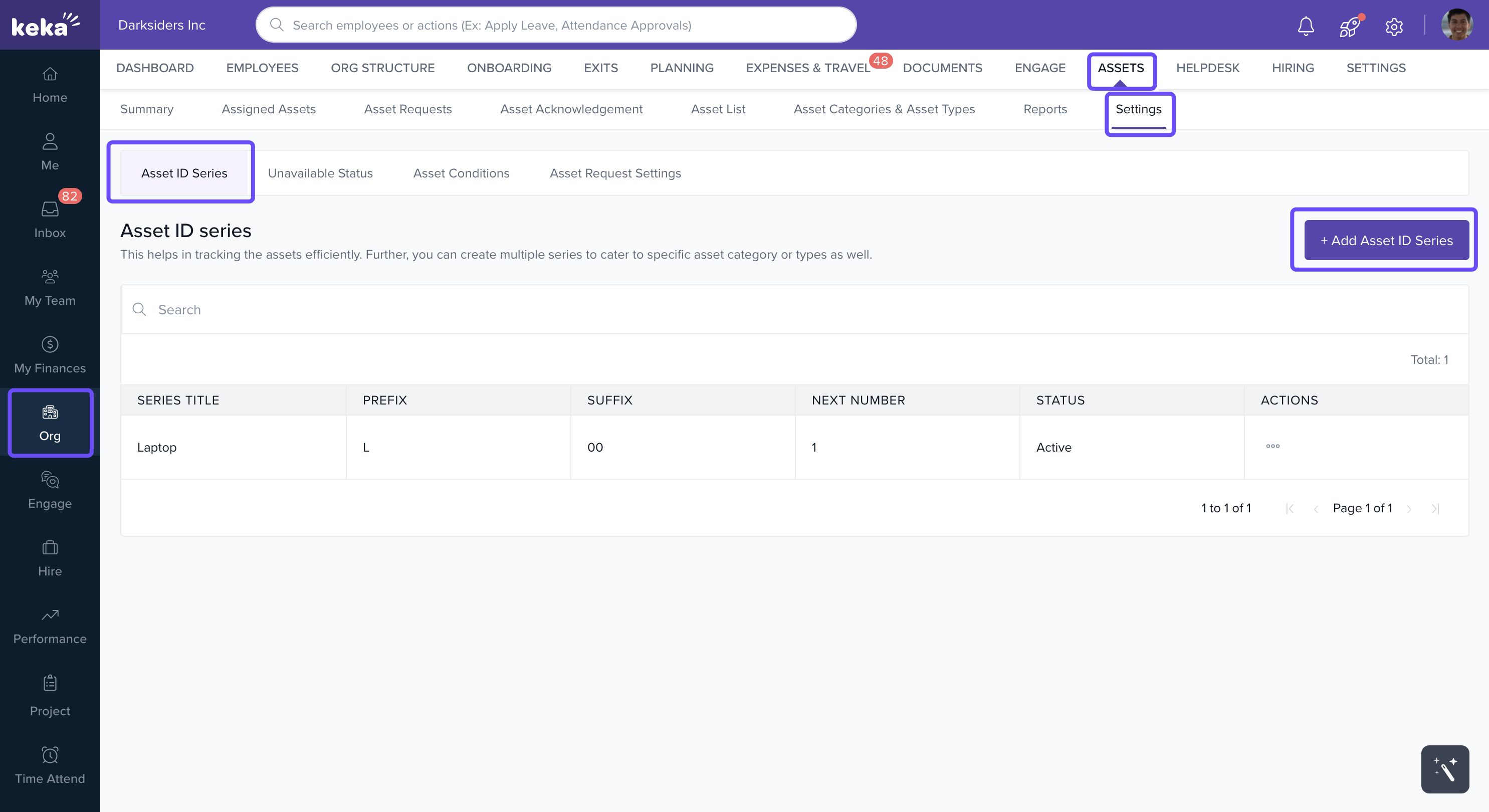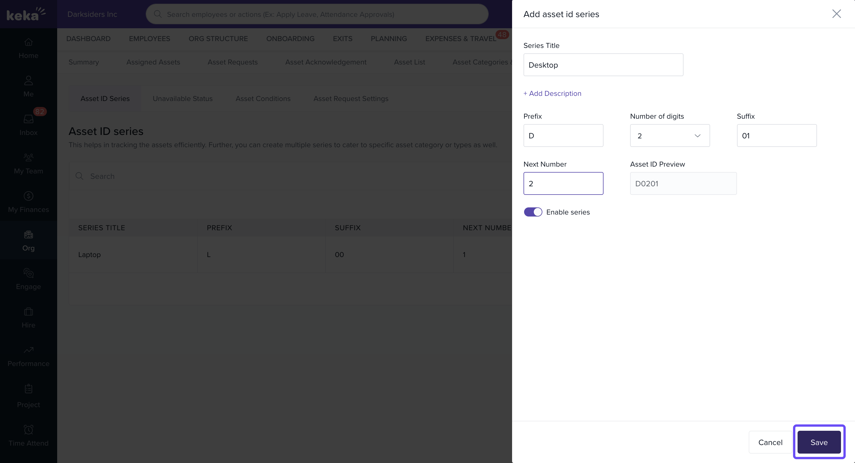 With Asset ID Series, you can define a structured format (prefix, numbering sequence, suffix) for asset IDs so that every new asset added follows the same numbering logic.