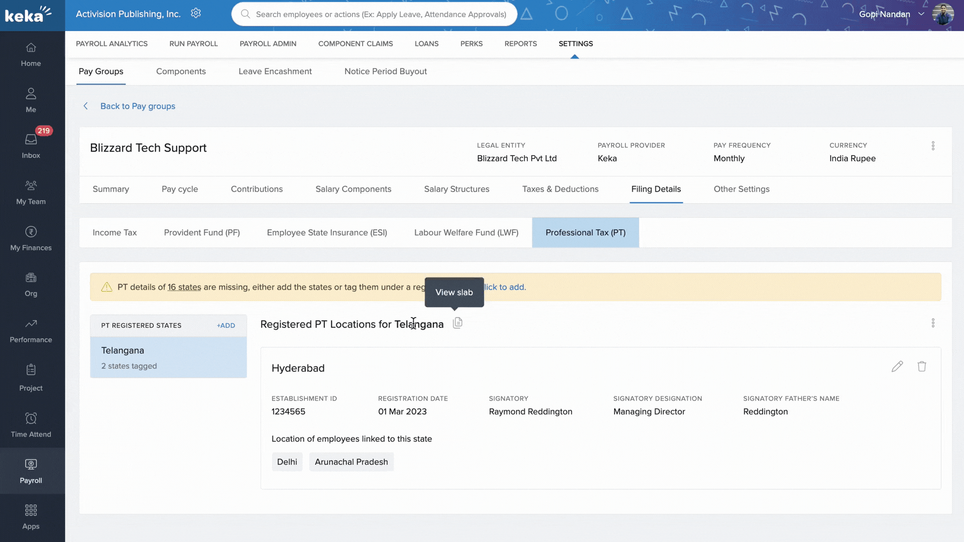 View tax slabs for registered states using the View Slab button.